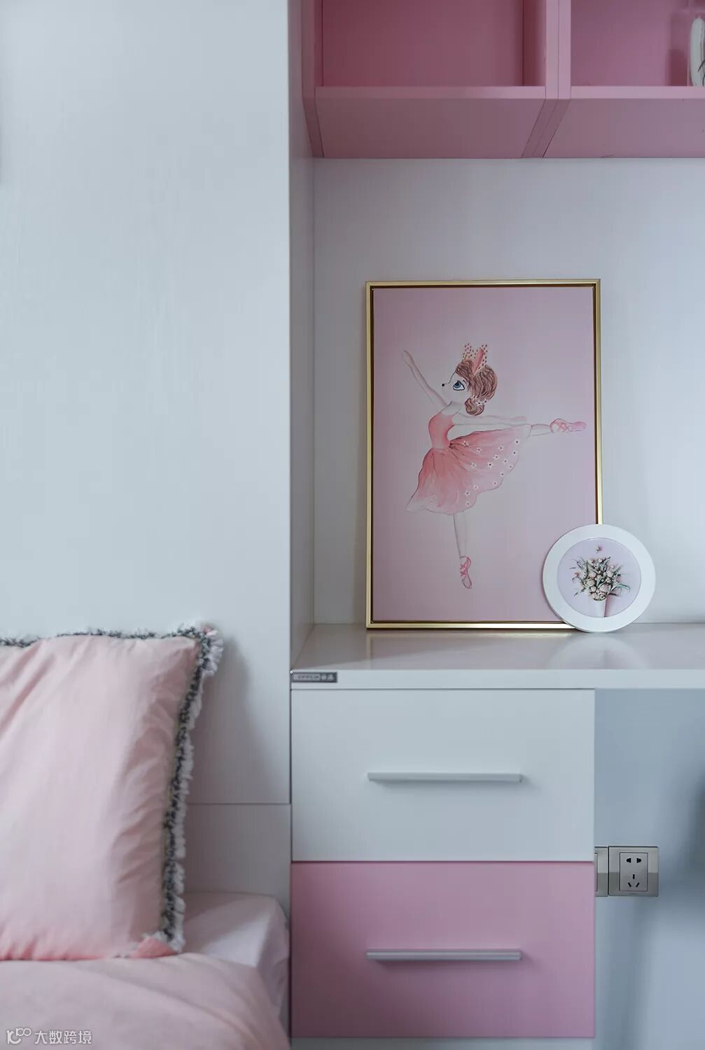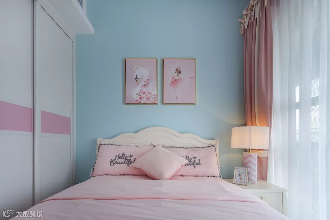 儿童房也做了精心布置,粉红天蓝的搭配让整个房间显得明亮又清新,几何体造型穿插在空间里,简洁又大方。