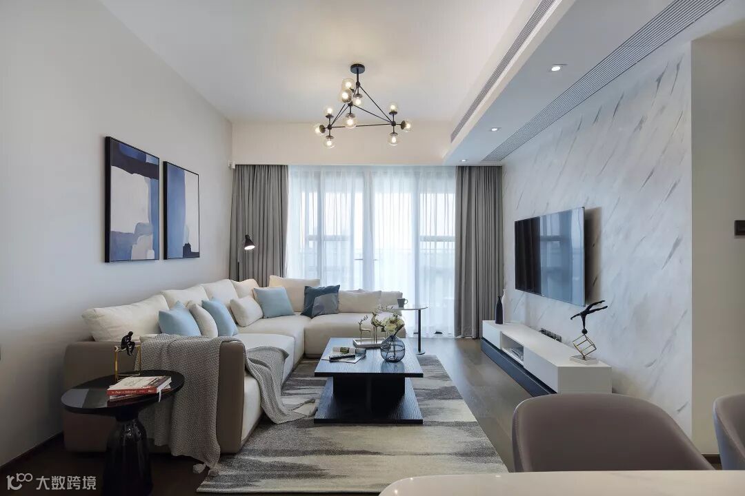 客厅是极简的现代风格:简单的几何形吊灯、干净留白的墙壁、温润木质的地板配上水墨画一样的地毯、点缀蓝色抱枕的米色沙发、还有那欲说还休的壁画。