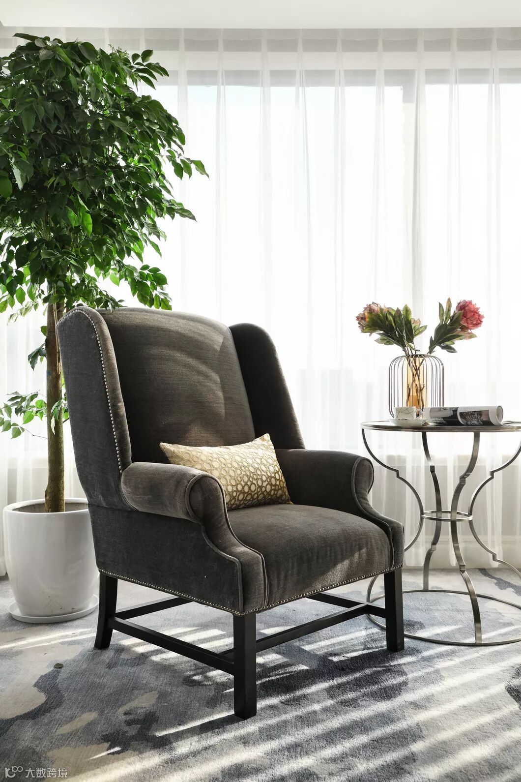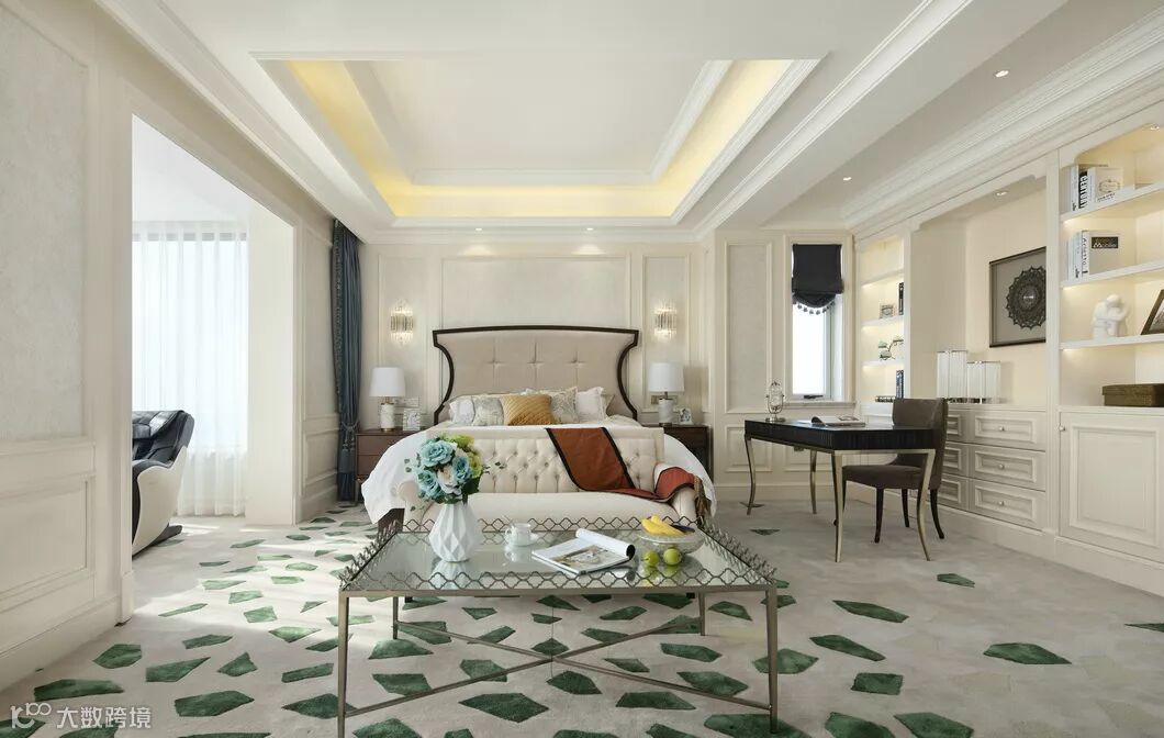 渲染泼墨般的灰蓝色地毯满铺在整个空间中,深色绒面装饰图案的壁纸先将空间颜色加以丰满,选用现代美式的简洁的家具放置,带有铜质锁边,包括灯具的选择上,都相互呼应。