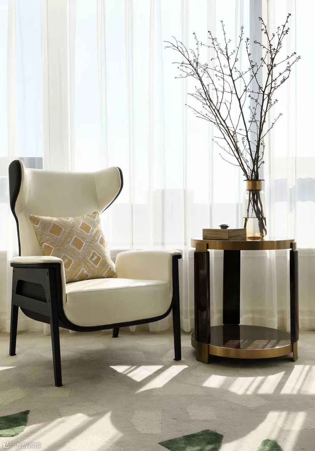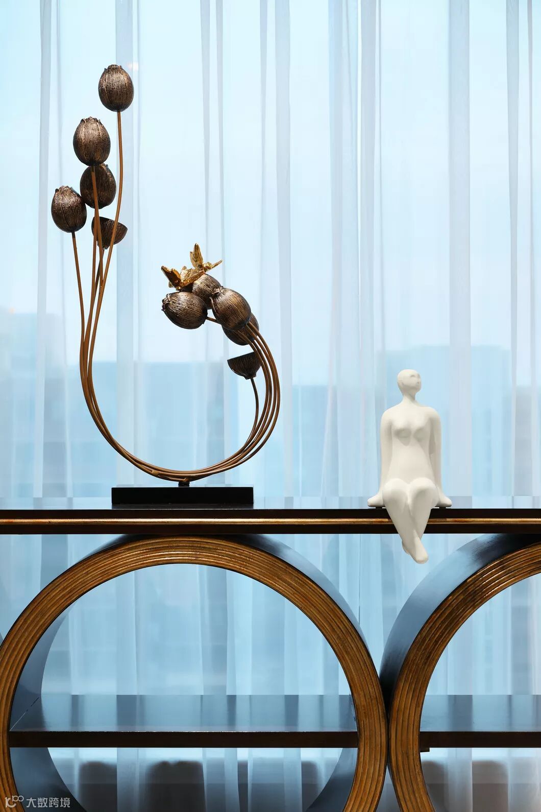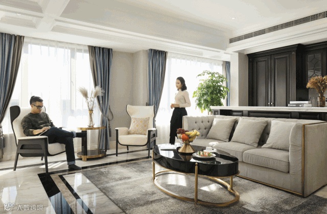 在客厅景色最美的纱帘前,陈设两处对称摆放的玄关桌,灯光随着灰蓝色的夜幕降临和白色渐变的纱帘交织。