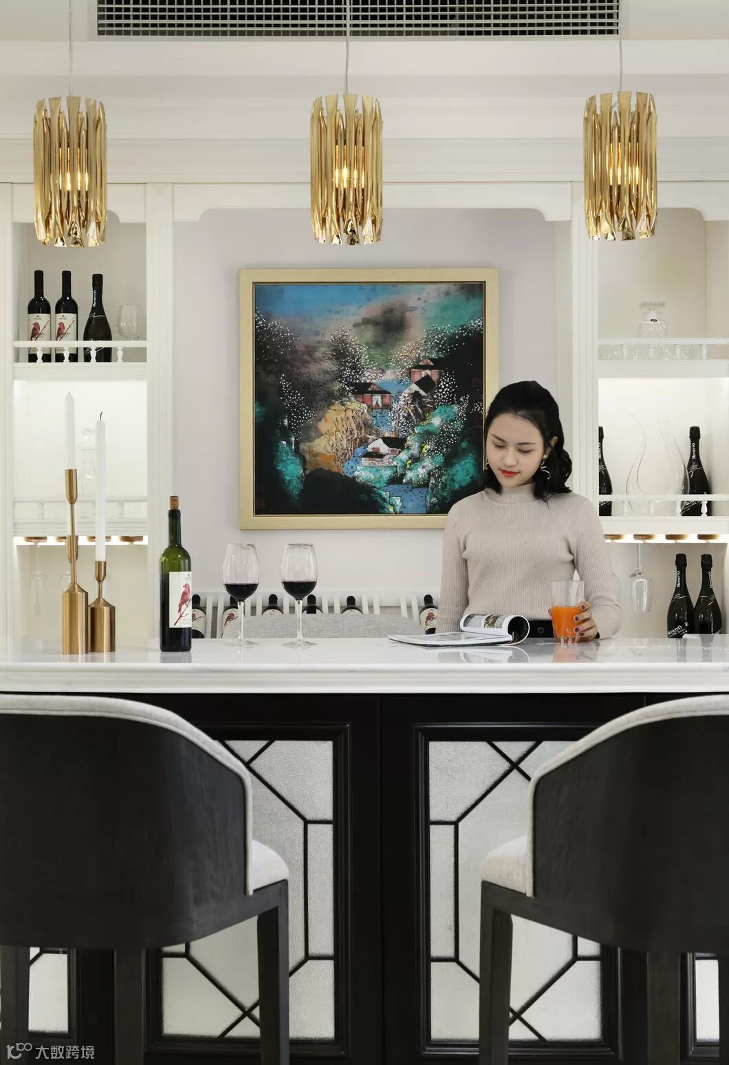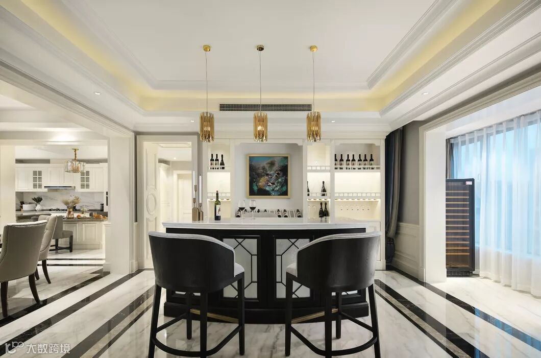 儿子有国外留学经历,喜欢品酒,于是随着会客厅的动线的另一端移动来到品鉴区,可以让他在这个区域享受音乐和美酒的交融。