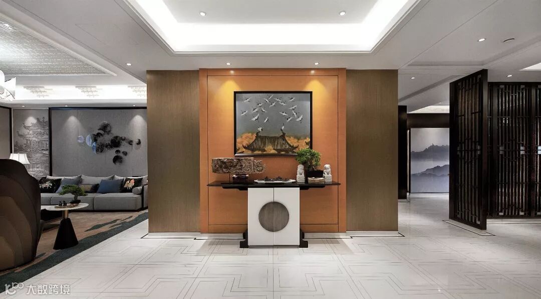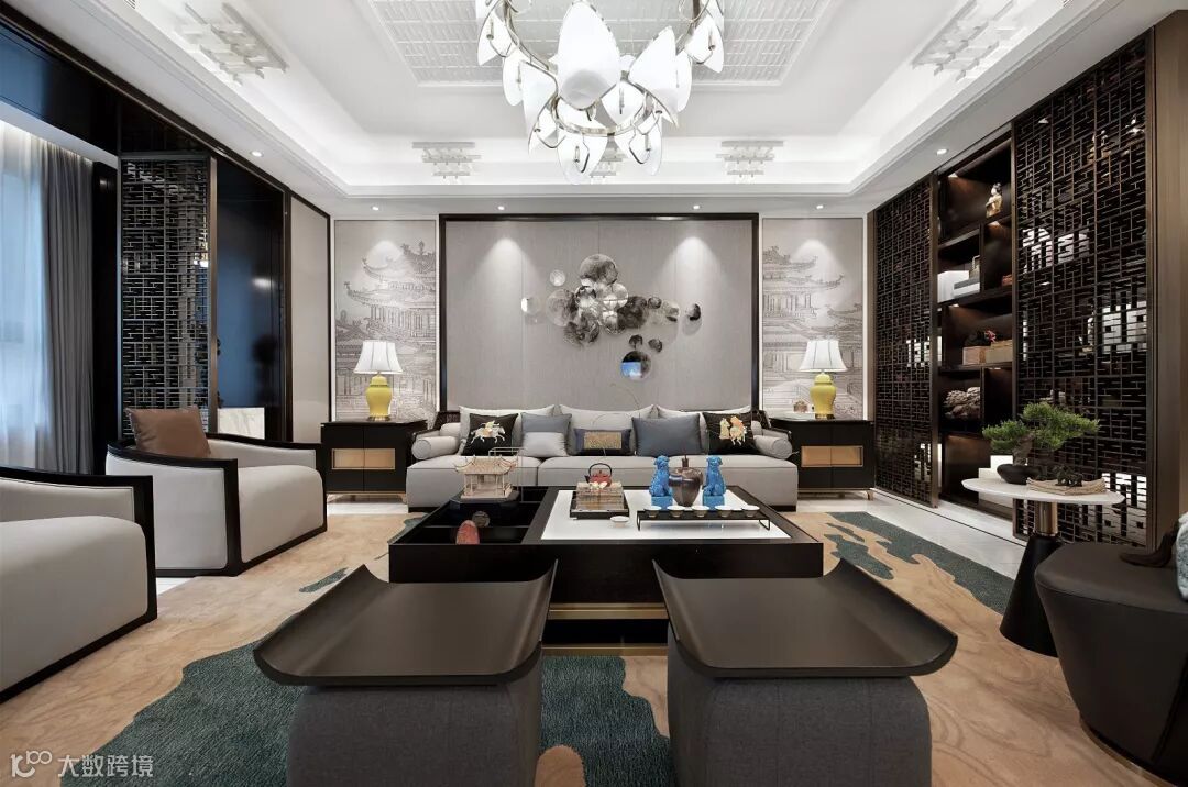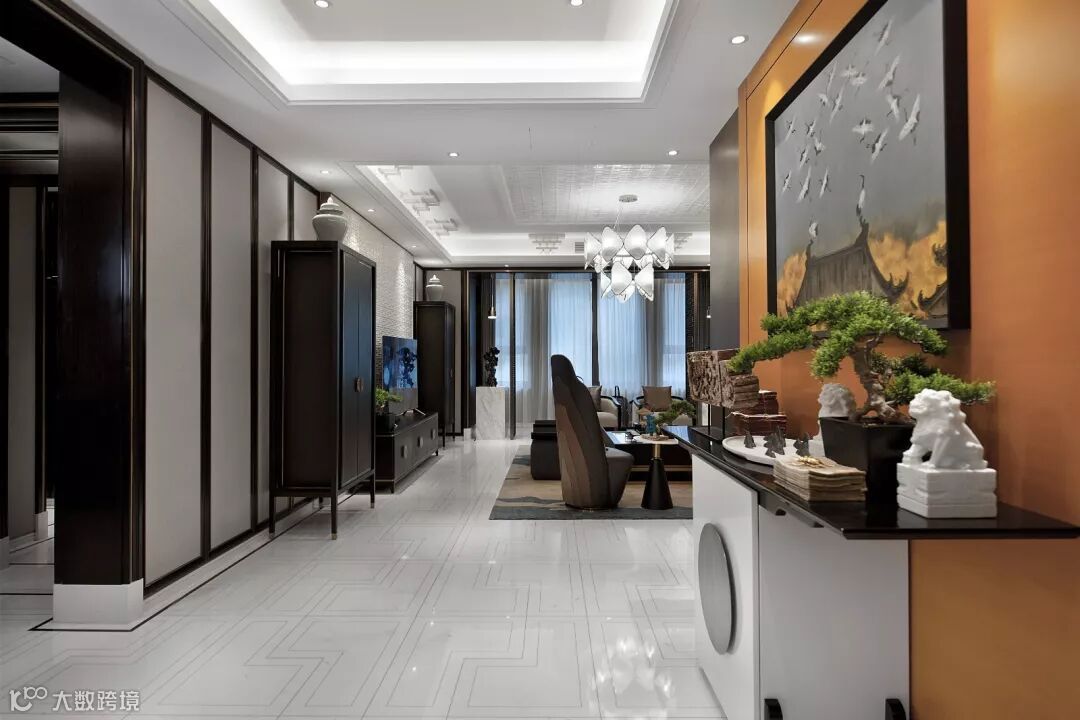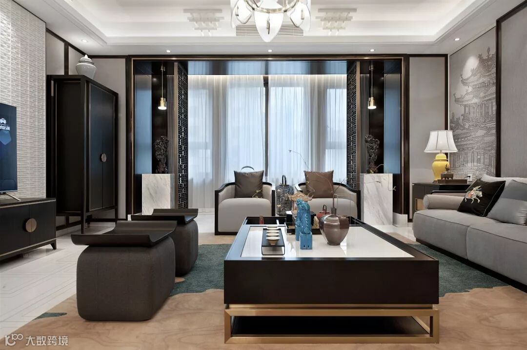 再以一些简约的造型为基础,添加中式元素,使整体空间感觉更加丰富,大而不空、厚而不重,有格调又不显压抑。