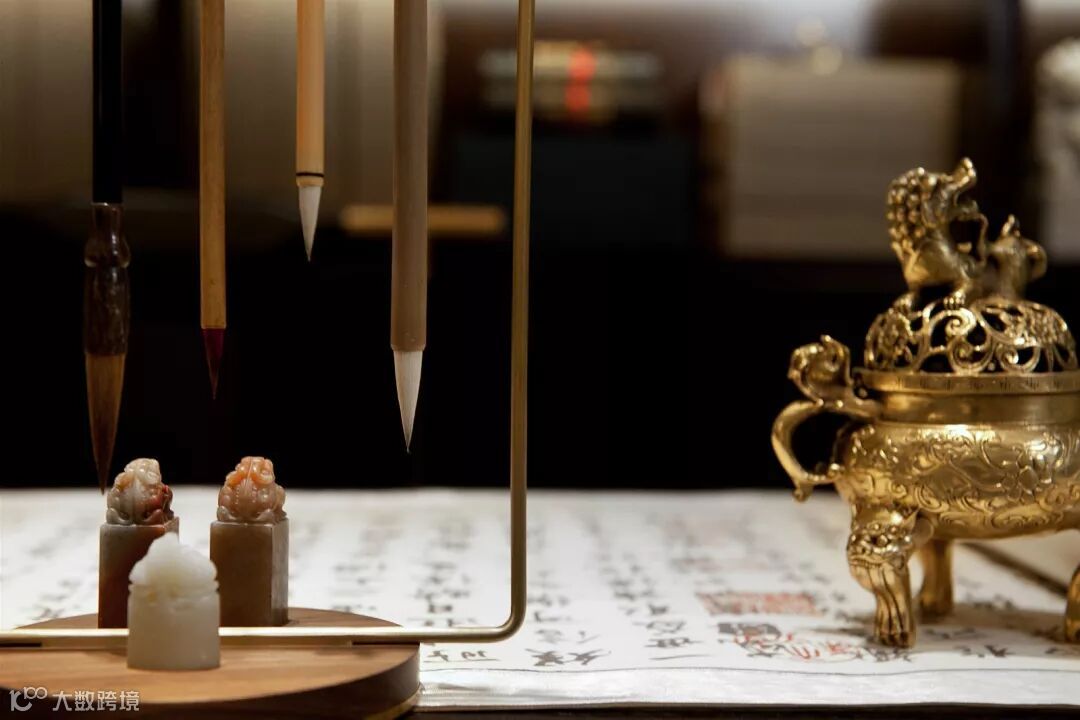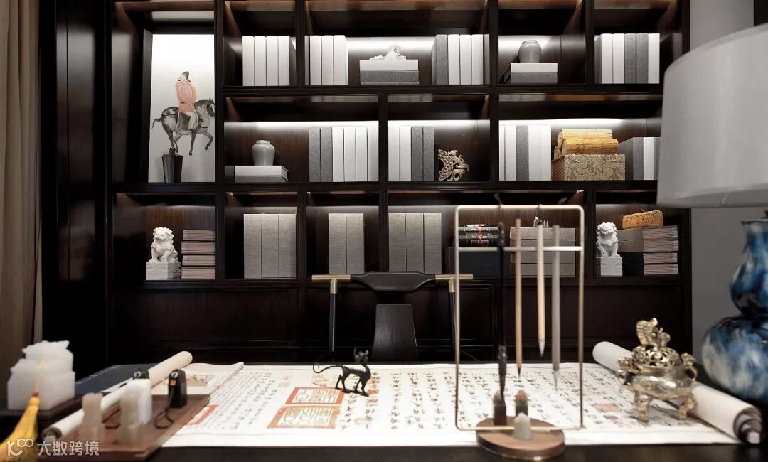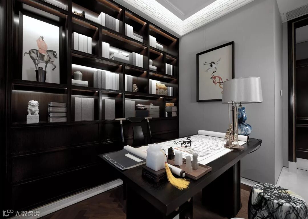 书房是一个有文化底蕴的空间必不可少的存在,深色原木案几,书架,太师座椅,古书、香炉、毛笔、玉玺......一应俱全。