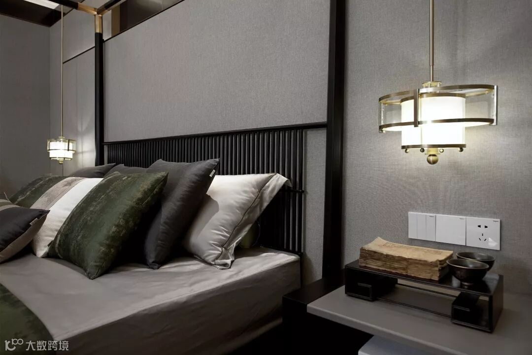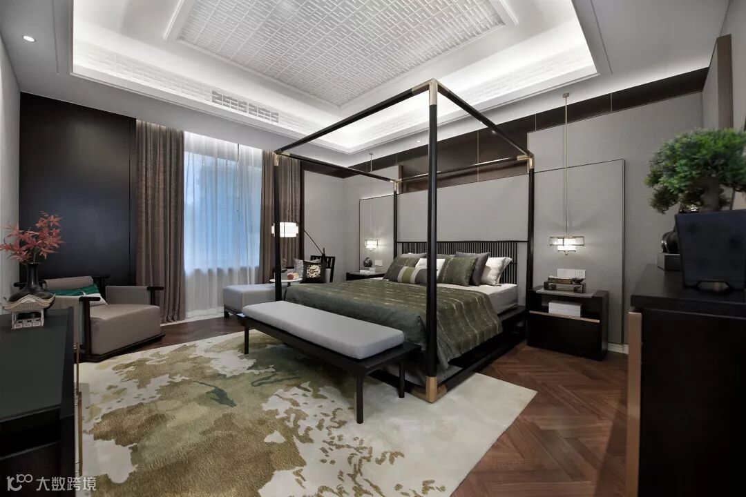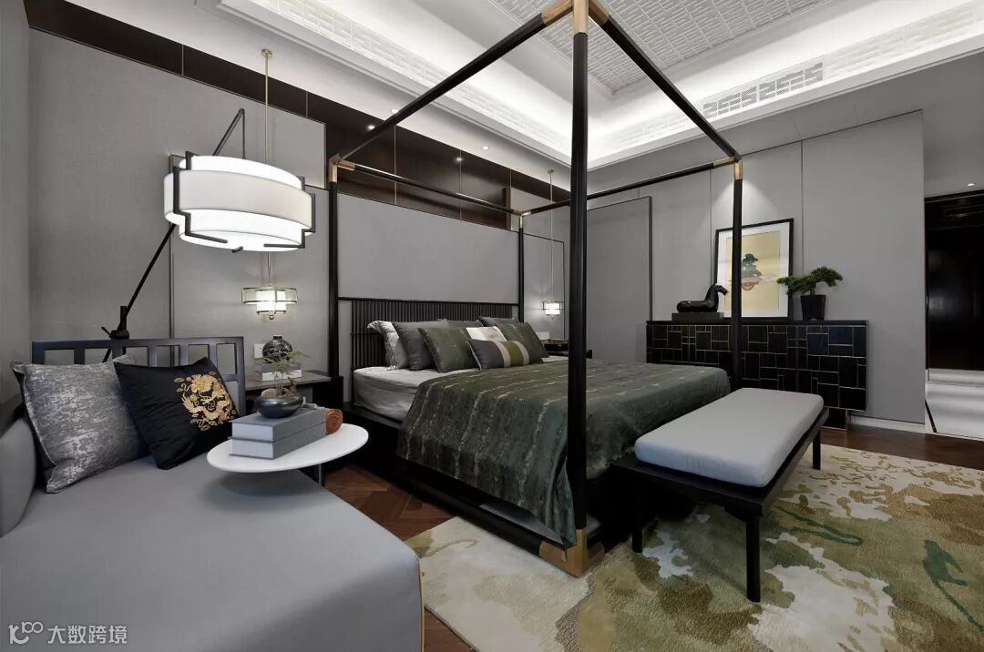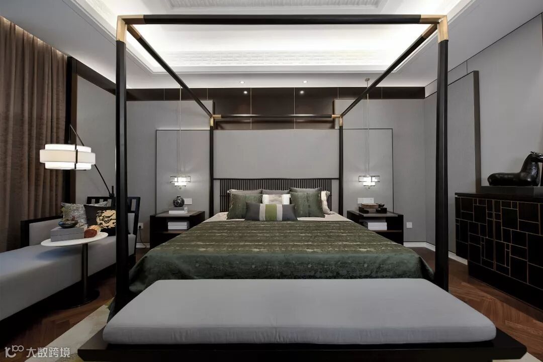 步入主人房,简洁明朗的黑色金属线条、稳重的中式架子床在暖色的灯光氛围里更添温馨舒适与尊贵典雅。