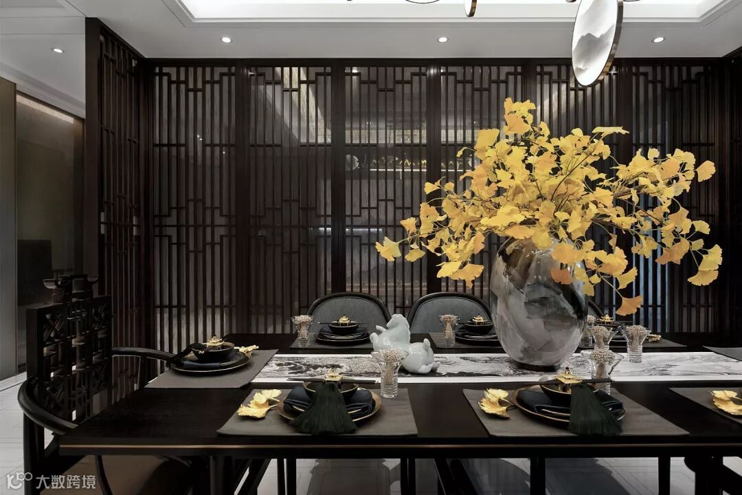 餐厅空间首先引入眼帘的是富有框架线条美的山水景观吊灯,对应稳重的深棕色木质餐桌,搭配深色中式花纹格栅和白色石材营造一种成熟稳重的空间感受。