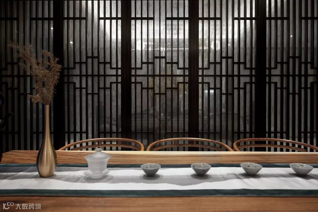 本案非常讲究空间的层次感,在需要隔绝视线的地方,则使用简约格纹镂空屏风隔断。利用屏风格栅之间的虚实对比,创造出既统一和谐又富有变化的室内空间。