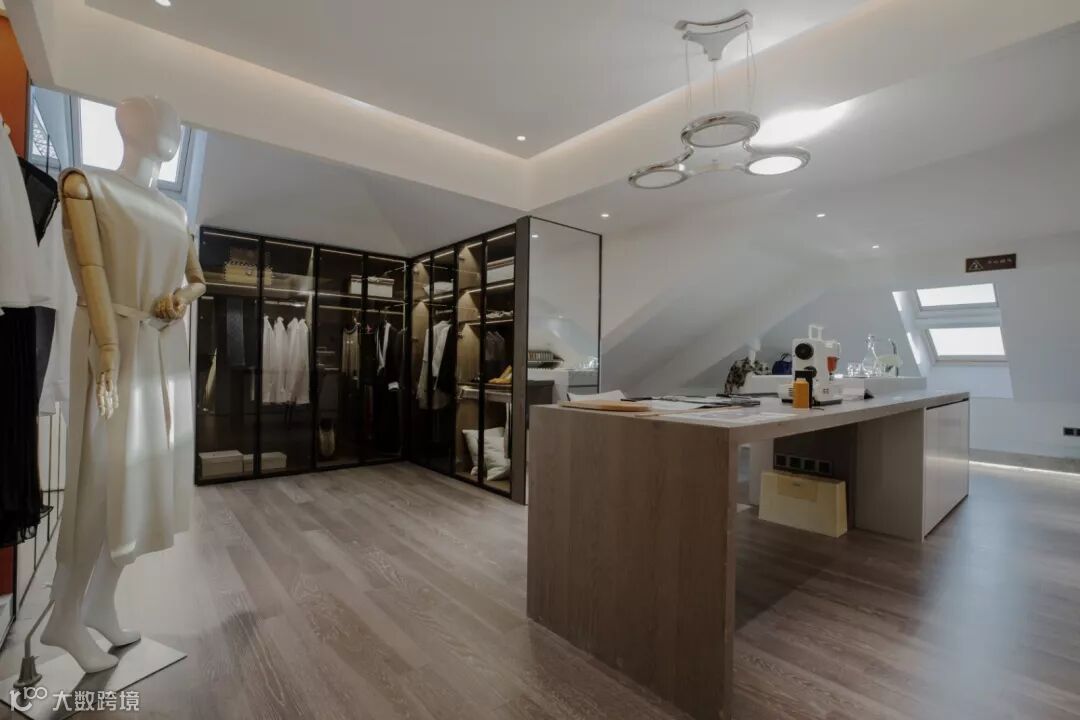 “除了空间内在的必要逻辑性,设计还应蕴含慰藉人心的精神力量。”拾级而上至阁楼,是特别为某高定服装女设计师定制的家庭工作室,根据工作内容,布置设计工作台。