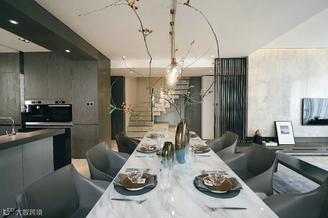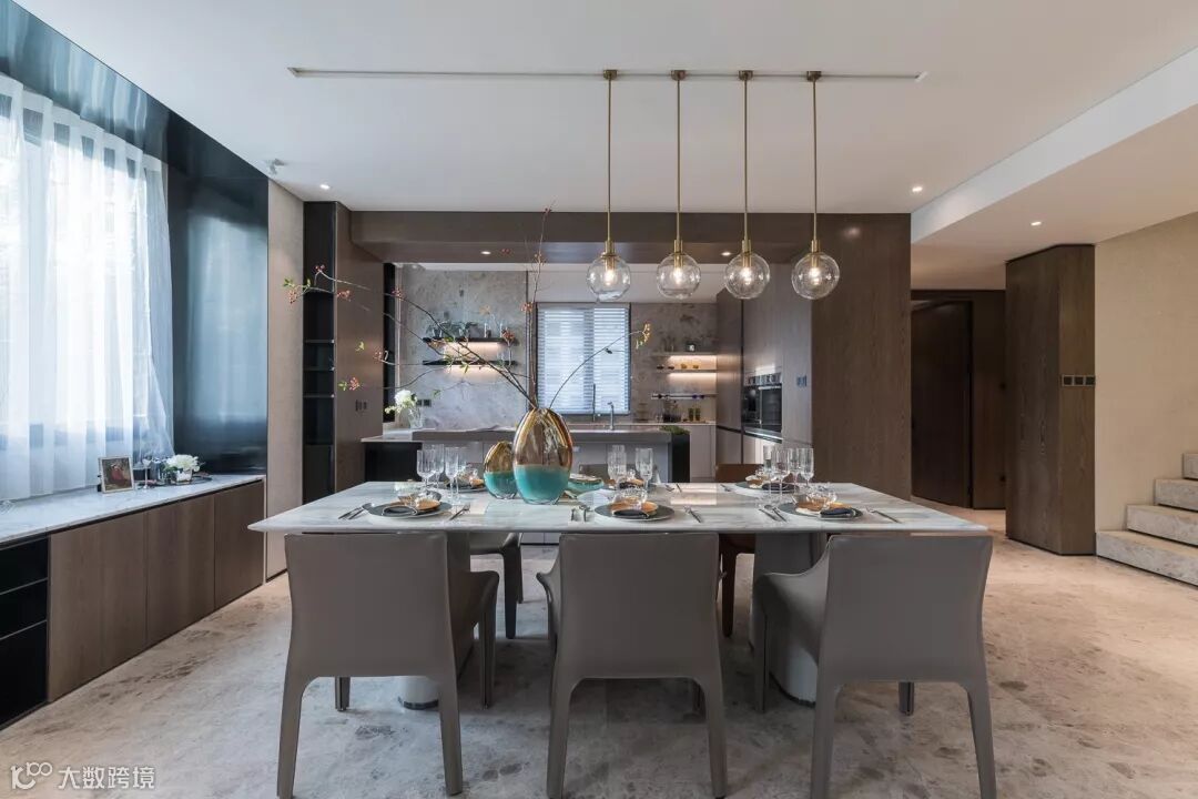 “延续”性的设计脉络,还体现在楼梯与餐厅的吊灯,相得益彰的出现,使餐厅成为横向与纵向两条空间动线的中心,更加精致完整。