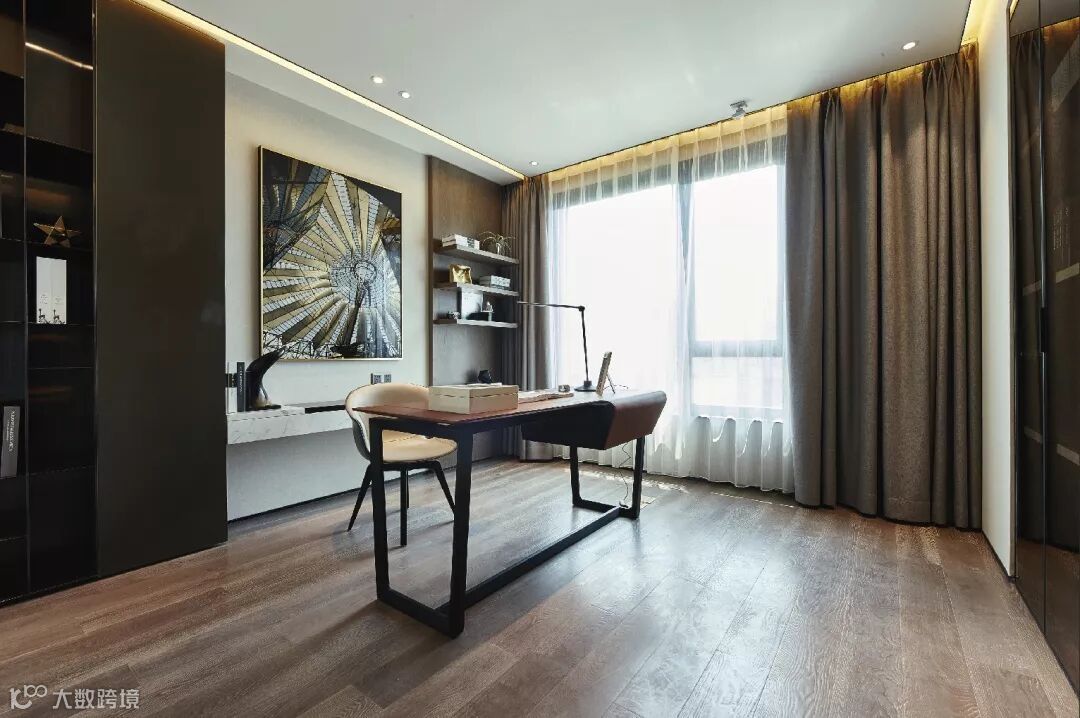 开放式书架、石材端景条台,搭置出沉稳雅致的空间气息。书桌面对的整面书柜门采用铝框玻璃门,阳光洒下,又有一种通透贯穿始终。