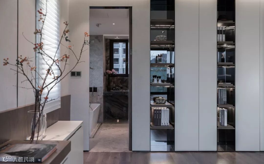 衣柜为整面漆板的柜门,结合开敞的层板架,带来虚实对比反差,从外观和实际功能赋予居住者全新的感受,仿佛置身于高端酒店,但也不失家的温暖。