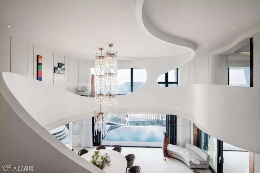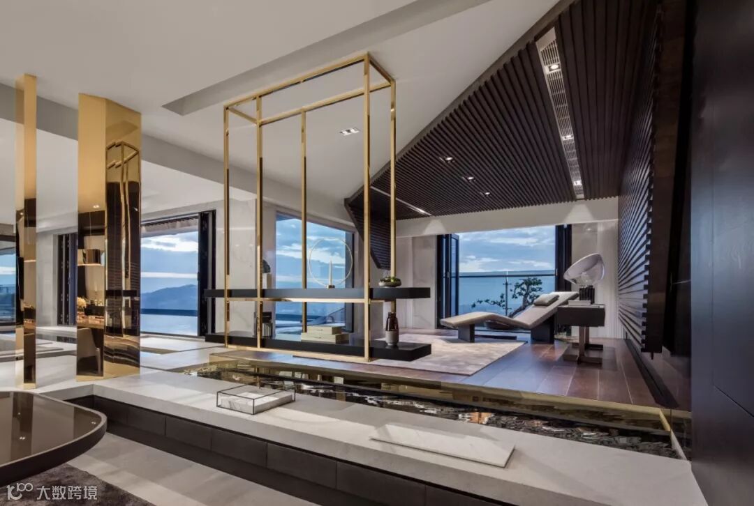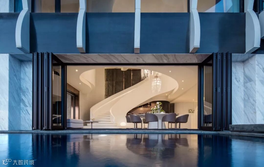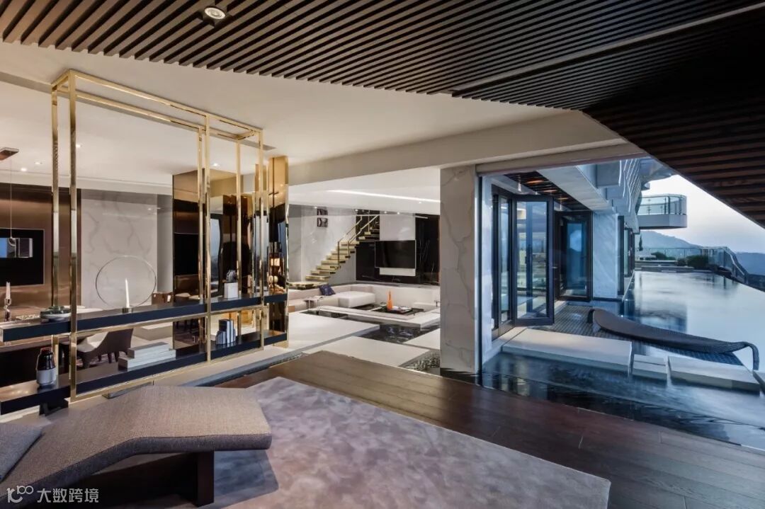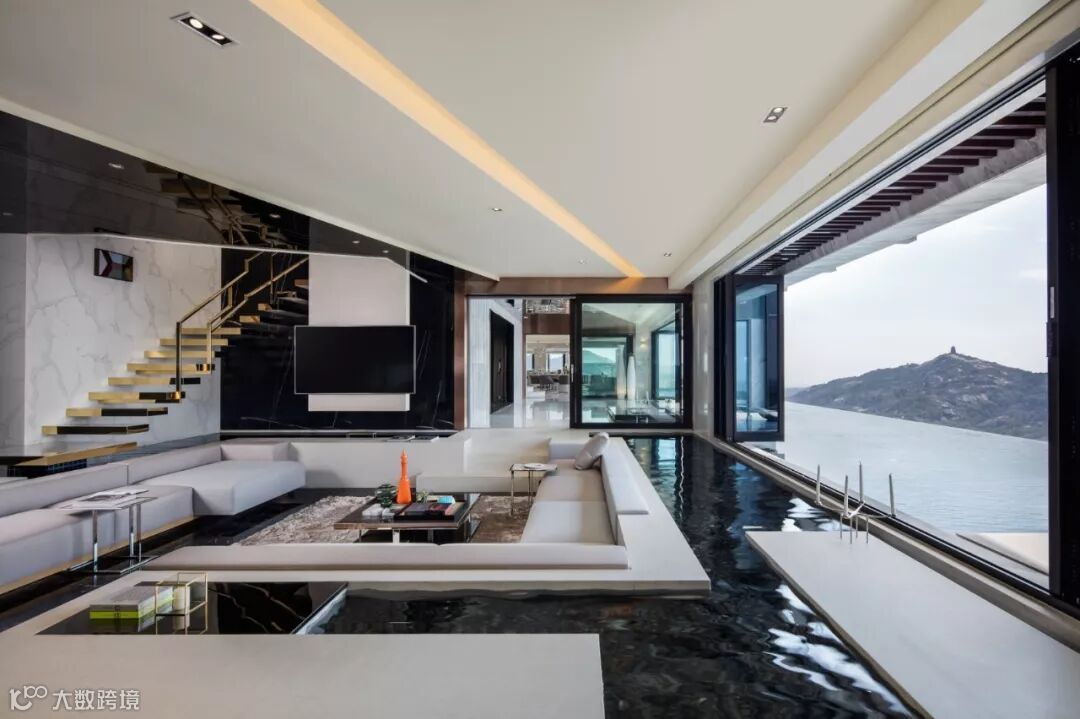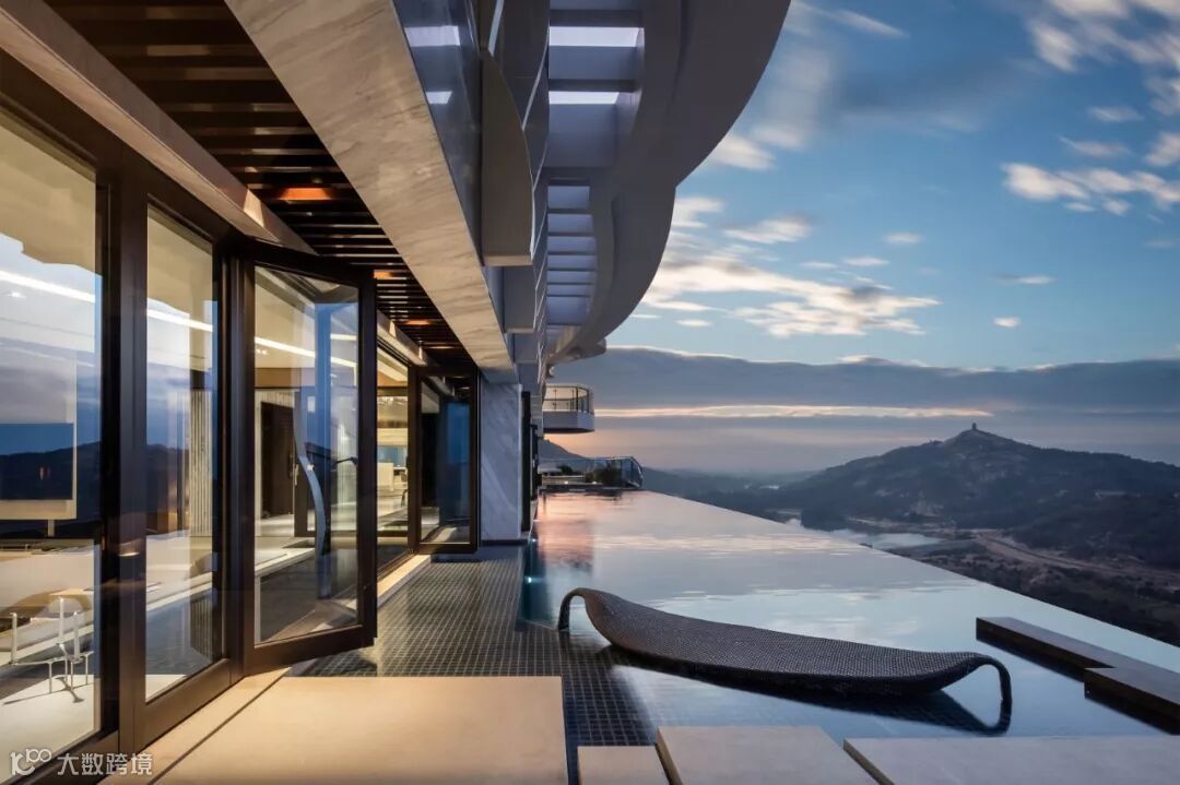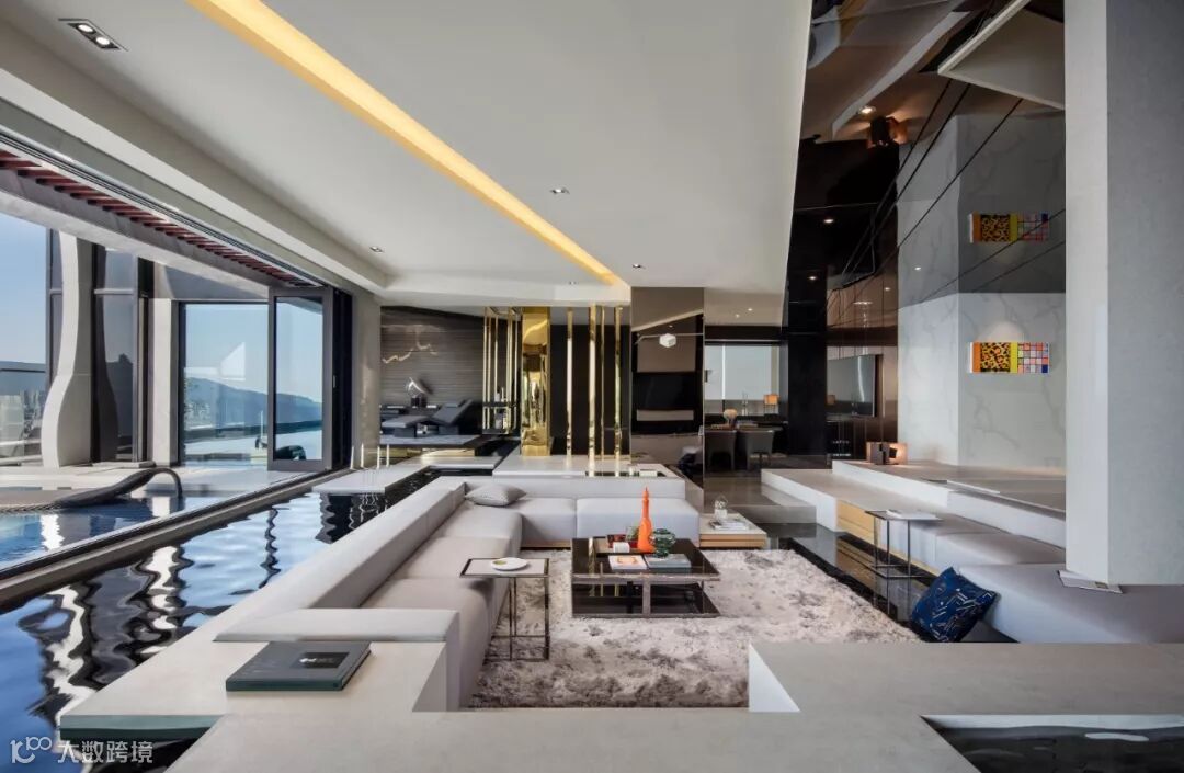建筑室内外空间的界限在此打破与模煳,塑造无边际泳池和下沉式客厅休息区,延续天际线的线条,让水系光景无限渗透至室内空间。