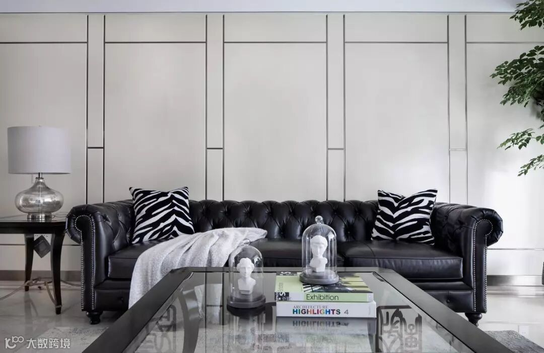 装饰着金属条的墙壁与深黑的真皮沙发为整个家定下了轻奢主义的基调。