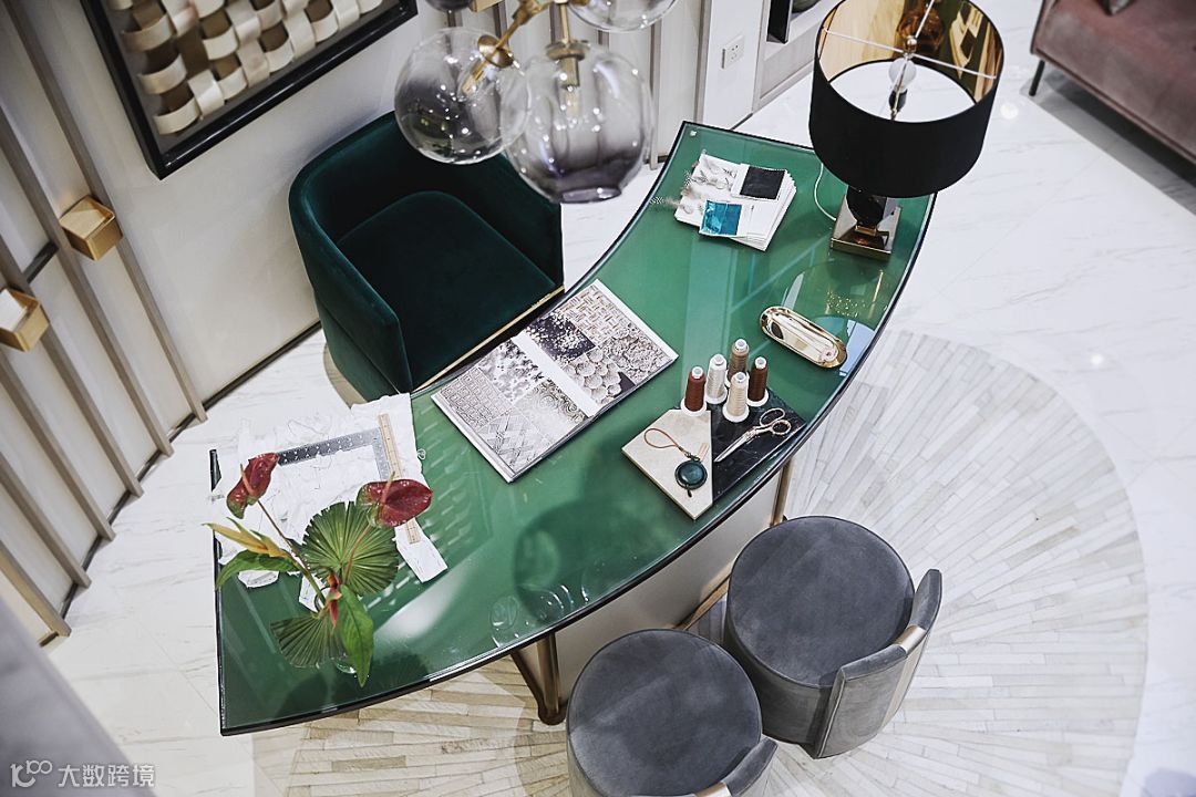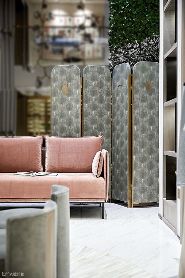 在清冷克制的空间里,用了琉璃绿色和灰桃红的对比撞色,转身又热烈灼炽,同一个视觉范围内的色彩对比,自我反省又妥协共生。