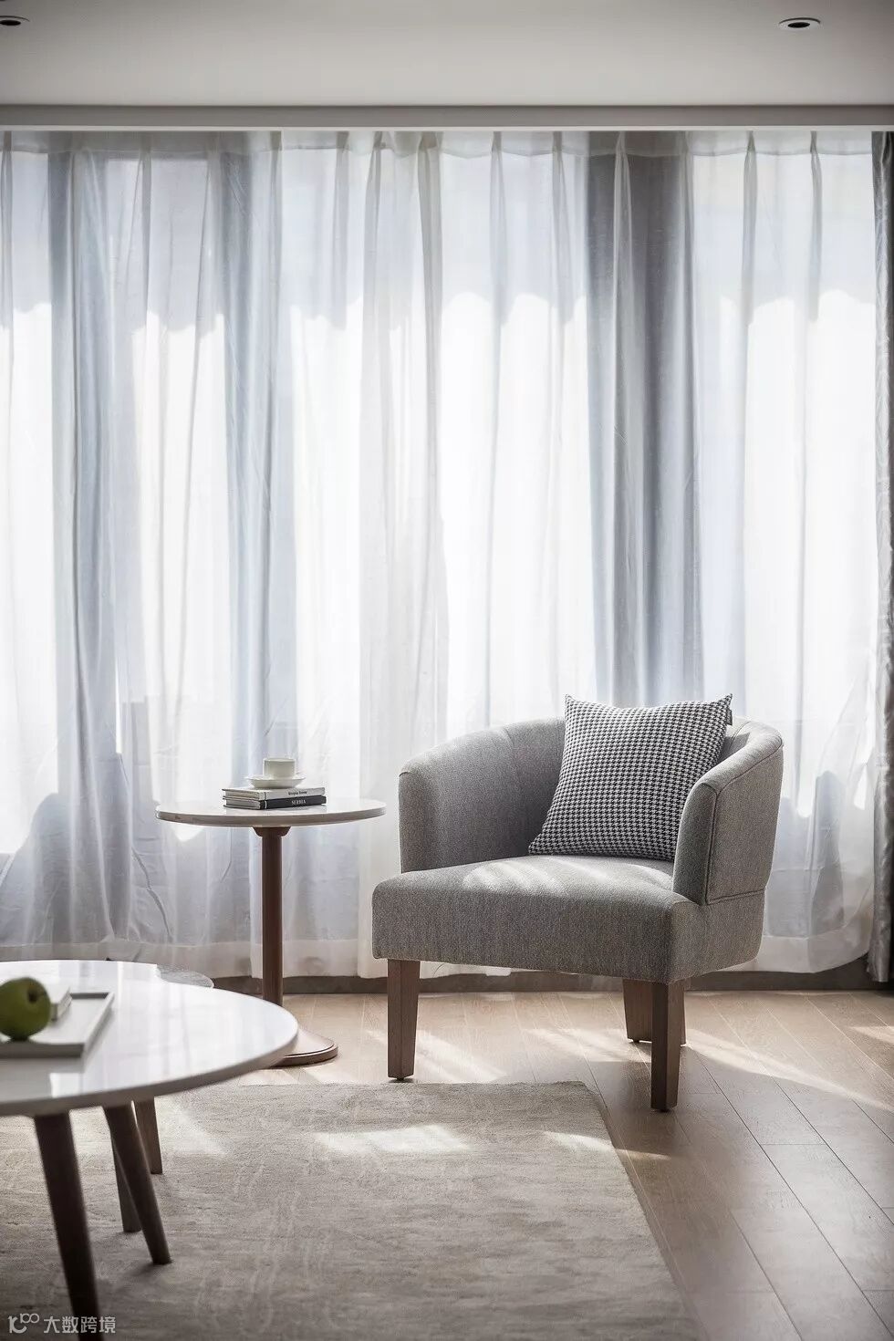 整体空间以暖灰色调为主,阳光渗透柔软的纱帘,带来灵动的气氛。精致的细节彰显高雅的品质,亦传达出居所无拘无束的自在感受。