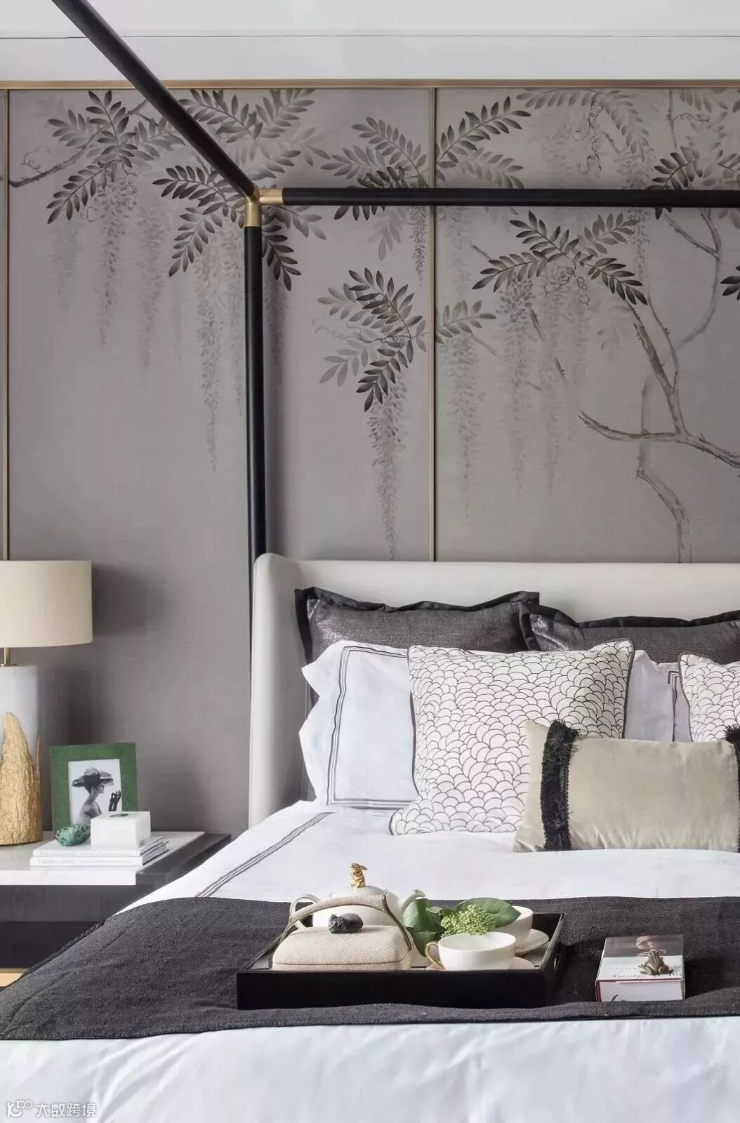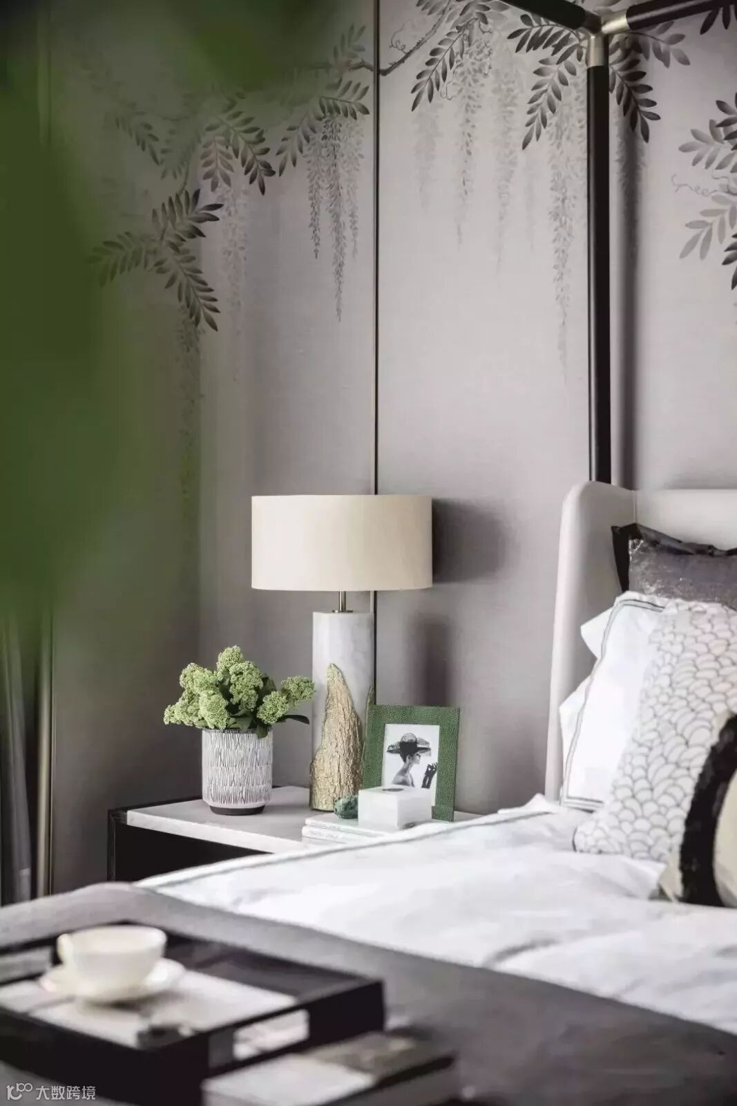 主卧的灰绿色真丝墙面,是蔓藤手绘画作的背景,从窗帘、床榻、植物到艺术装置,这一抹宁静且深沉的绿,娓娓道来的,是空间之生命力。