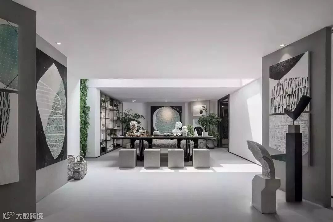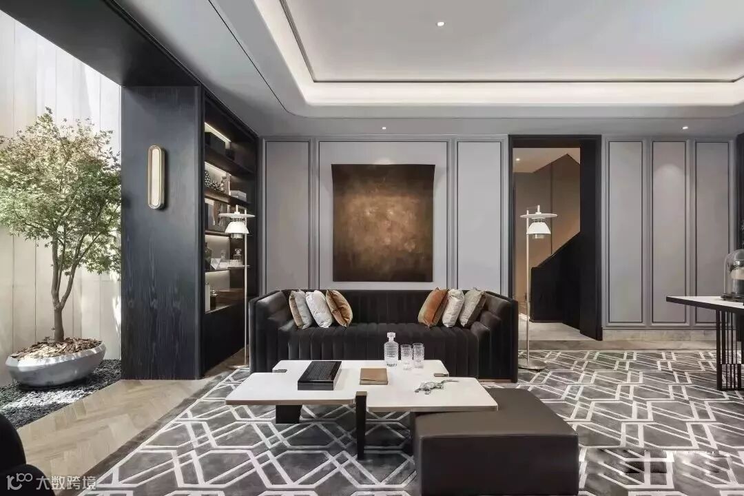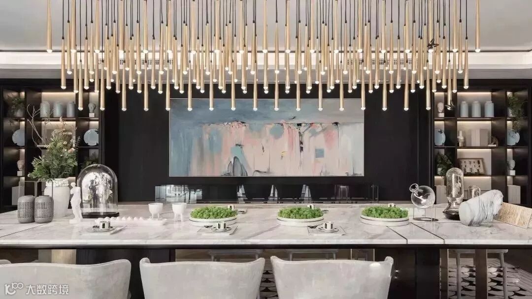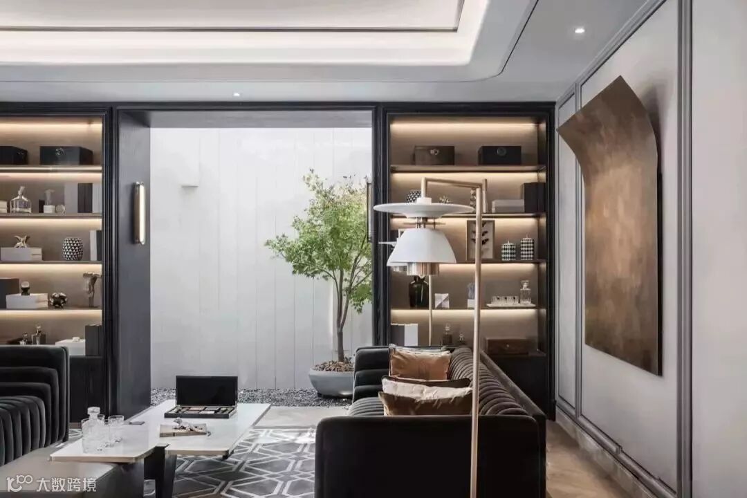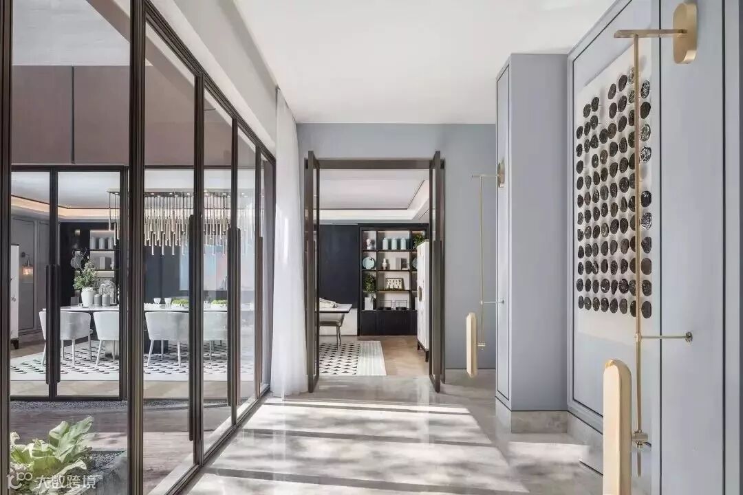 通过门厅进入室内,客厅画廊成为人的视觉停留点,点簇、曲线构成的艺术画作,不断重叠排列,犹如树的年轮循环往复,在未来的生活留下时间的记忆。