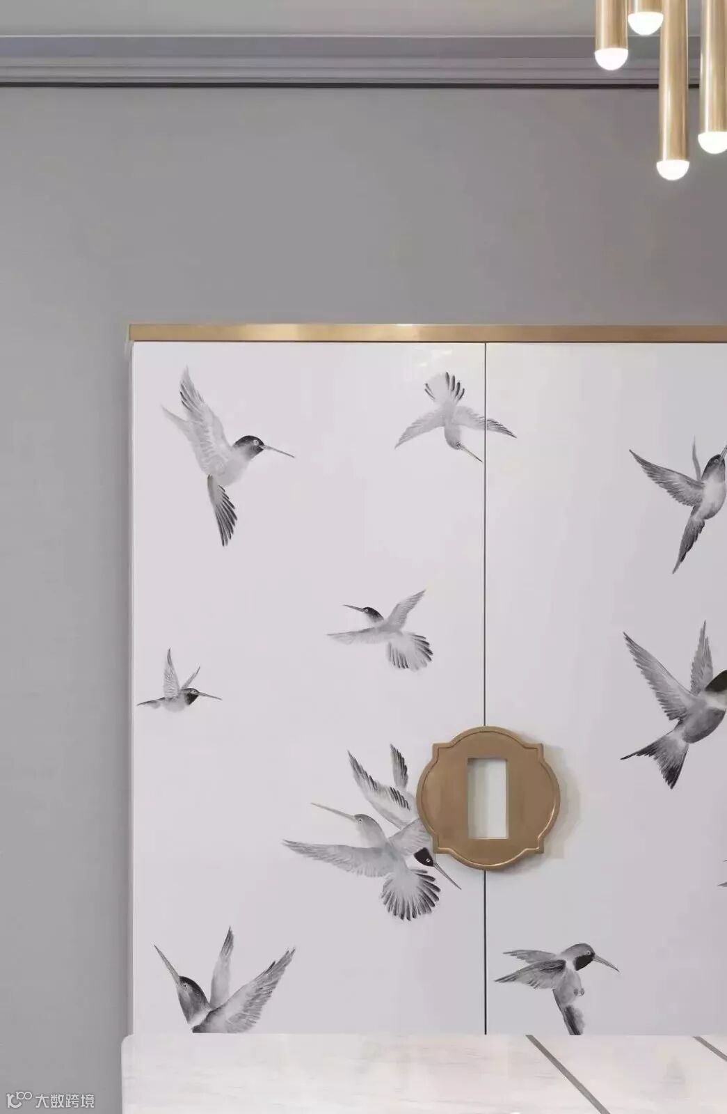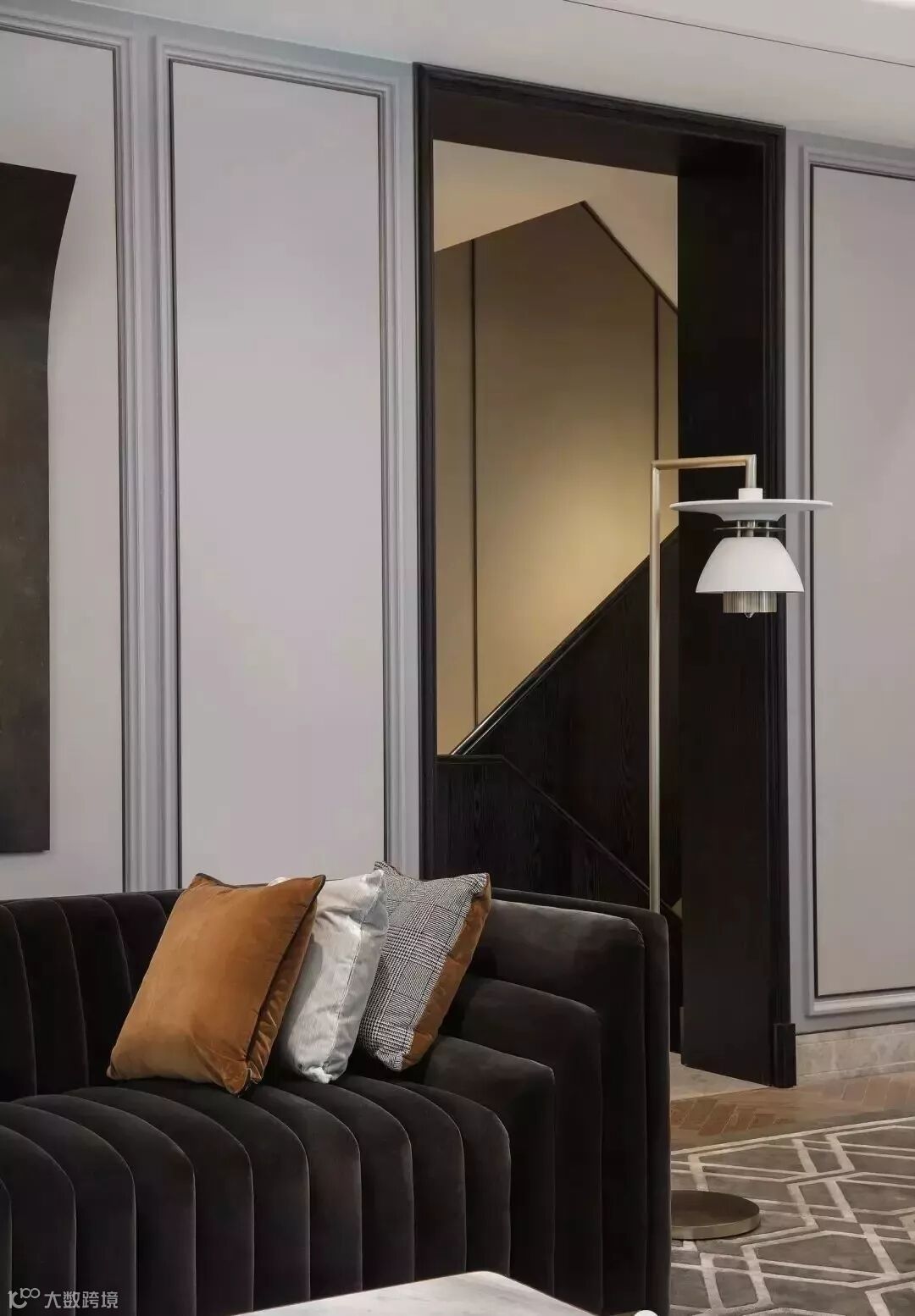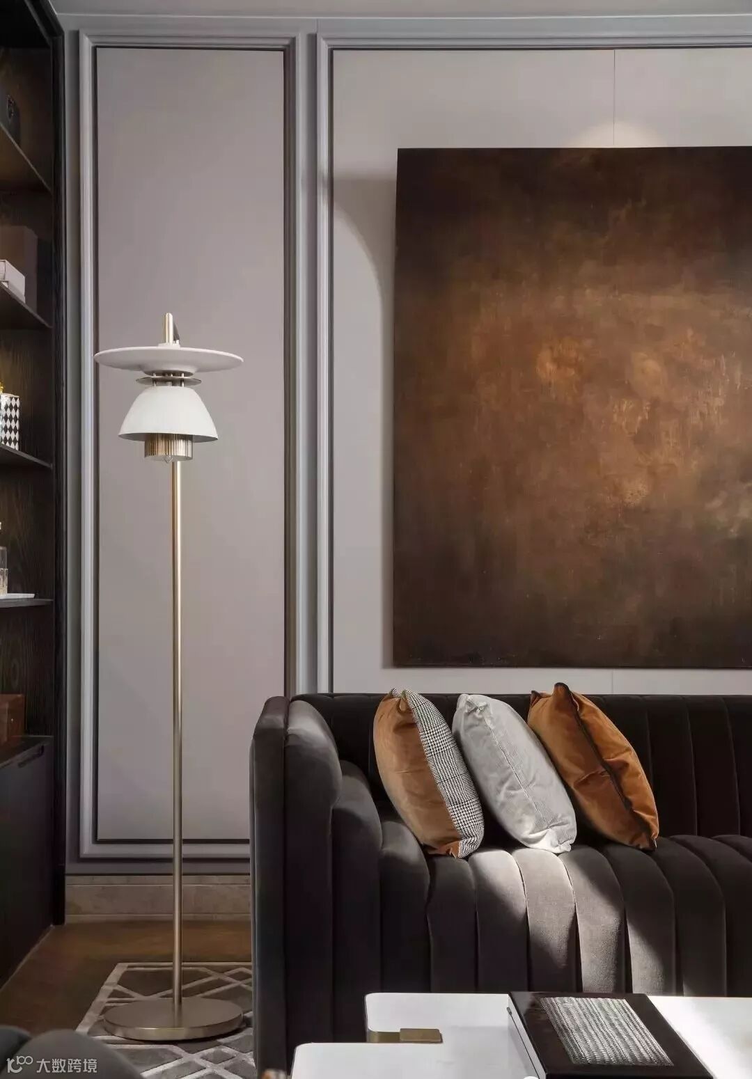 通过门厅进入室内,客厅画廊成为人的视觉停留点,点簇、曲线构成的艺术画作,不断重叠排列,犹如树的年轮循环往复,在未来的生活留下时间的记忆。