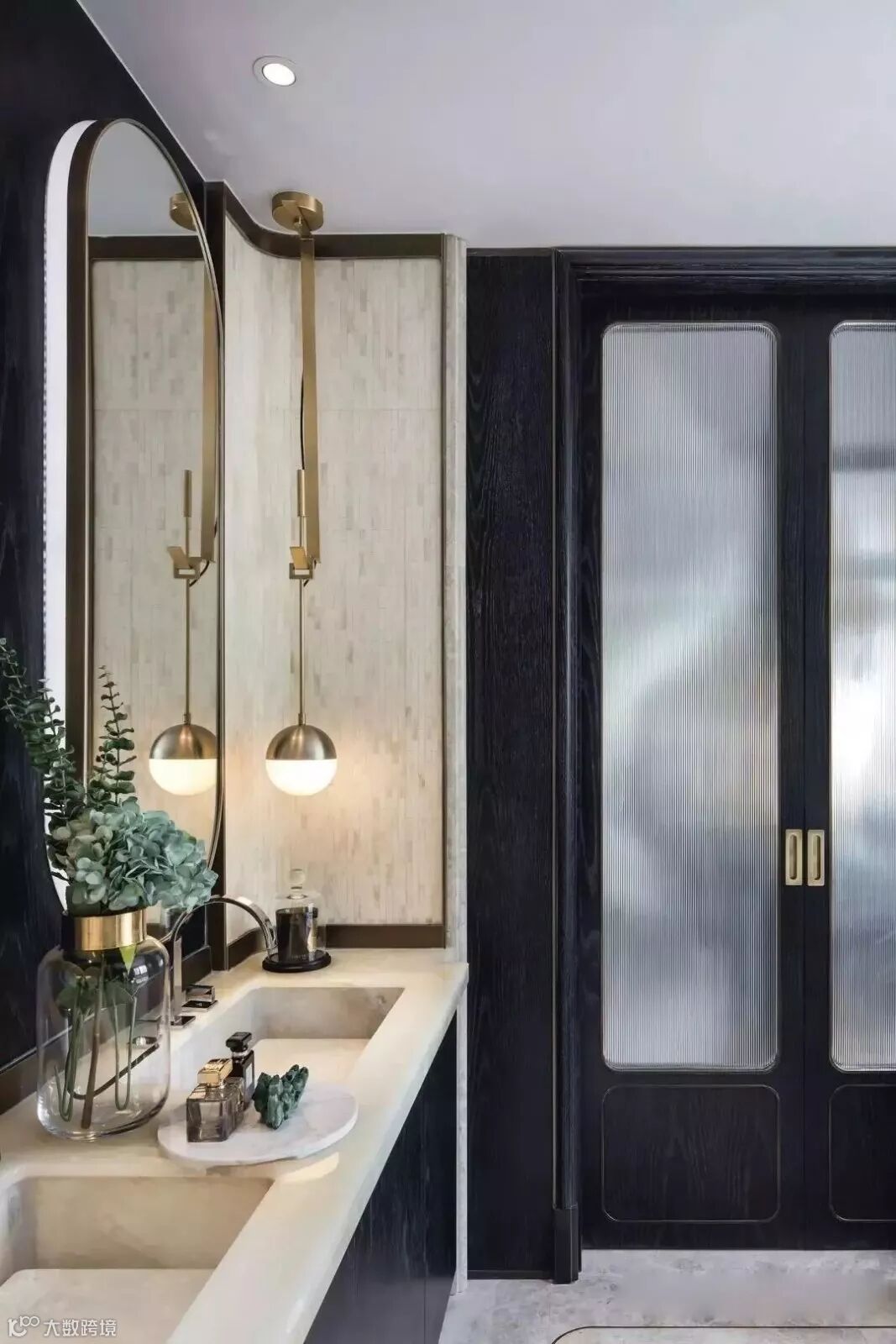 两道条纹玻璃移门,若隐若现地分隔着衣帽间、卫生间,形成有光流过的界定,“重其意而不苟其形,重其趣而不苟其法”。