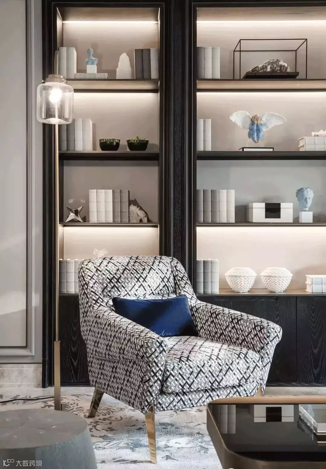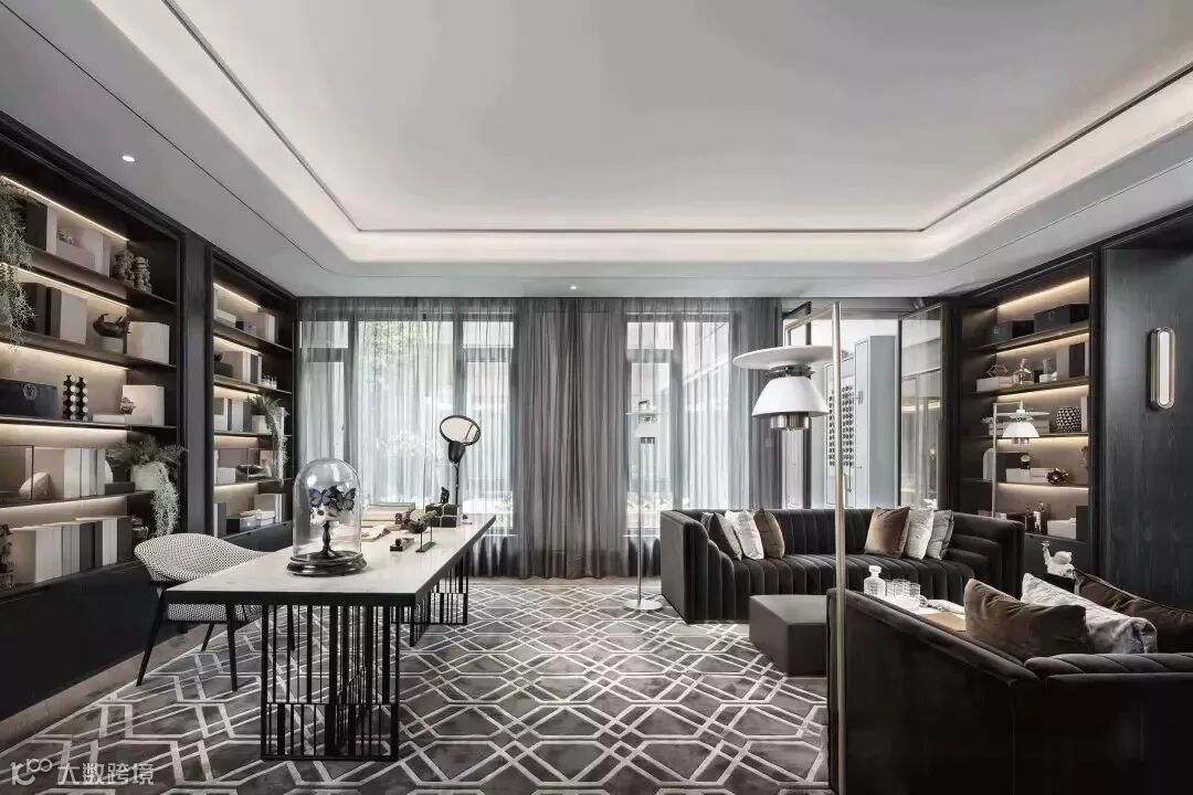 桌支脚形态源于“屏风”的抽象演绎,由线组合的交叉面构成;深色的书柜墙面,被柔和的隔板灯光打亮,横向线条更与空间的书香气韵共同突显。
