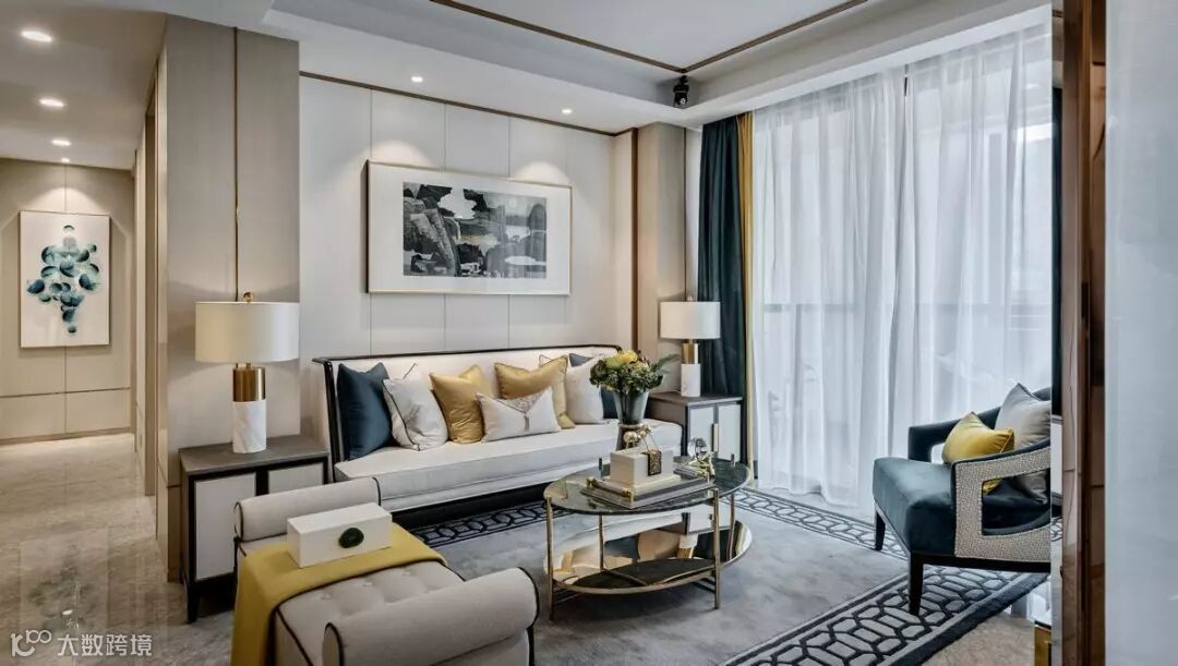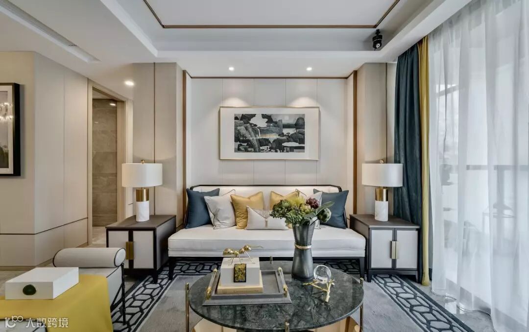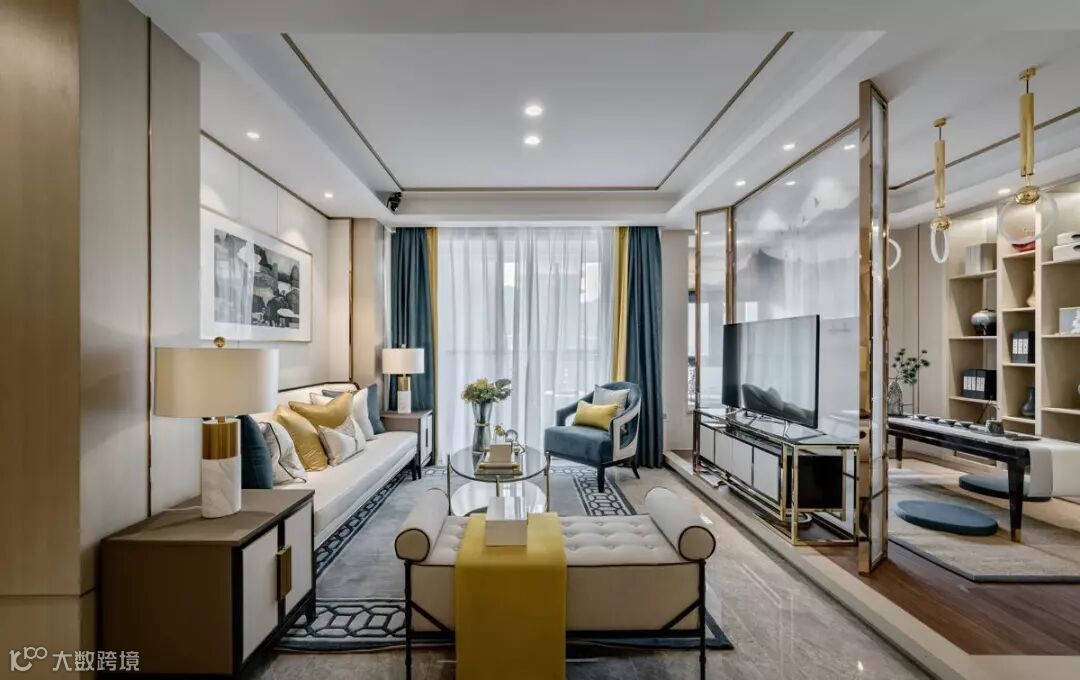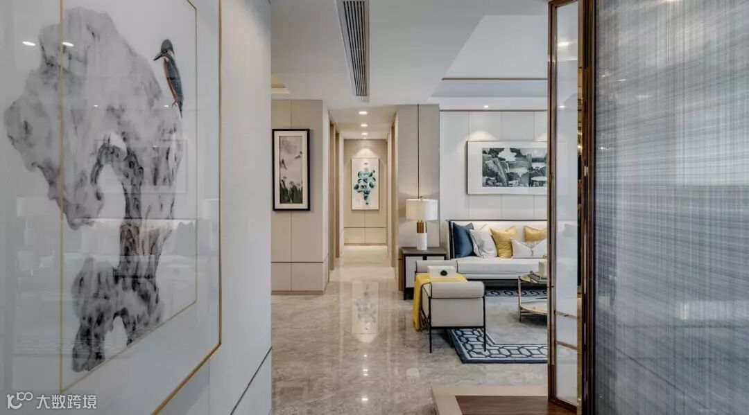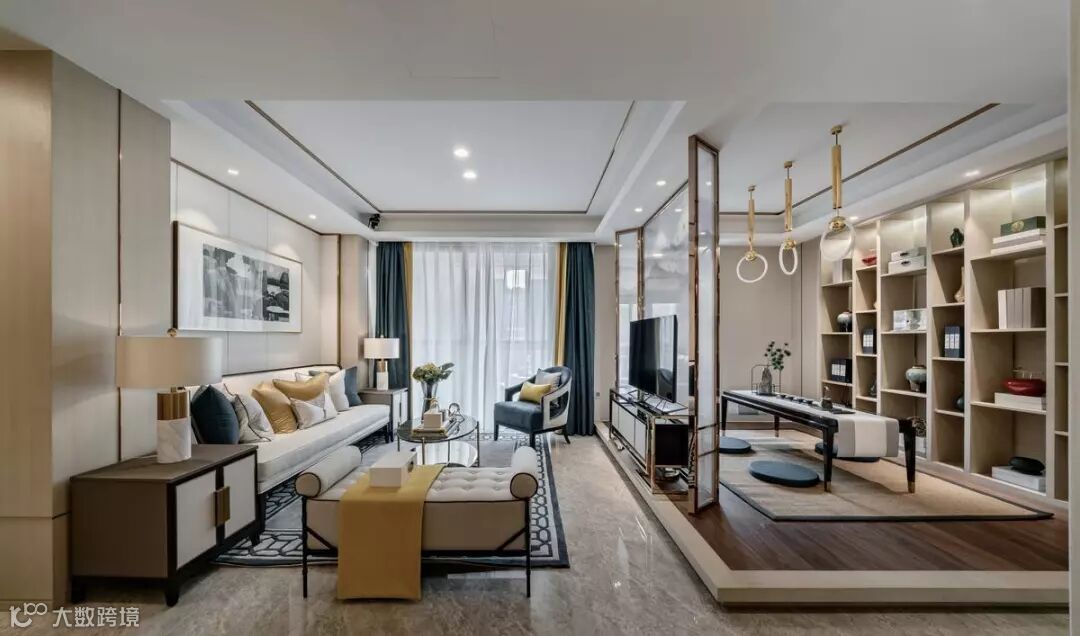板房空间承袭售楼中心的奢雅范,但蓝与黄的色彩组合在现代中式的空间里变得更为内敛,也生发出了特有的韵味。