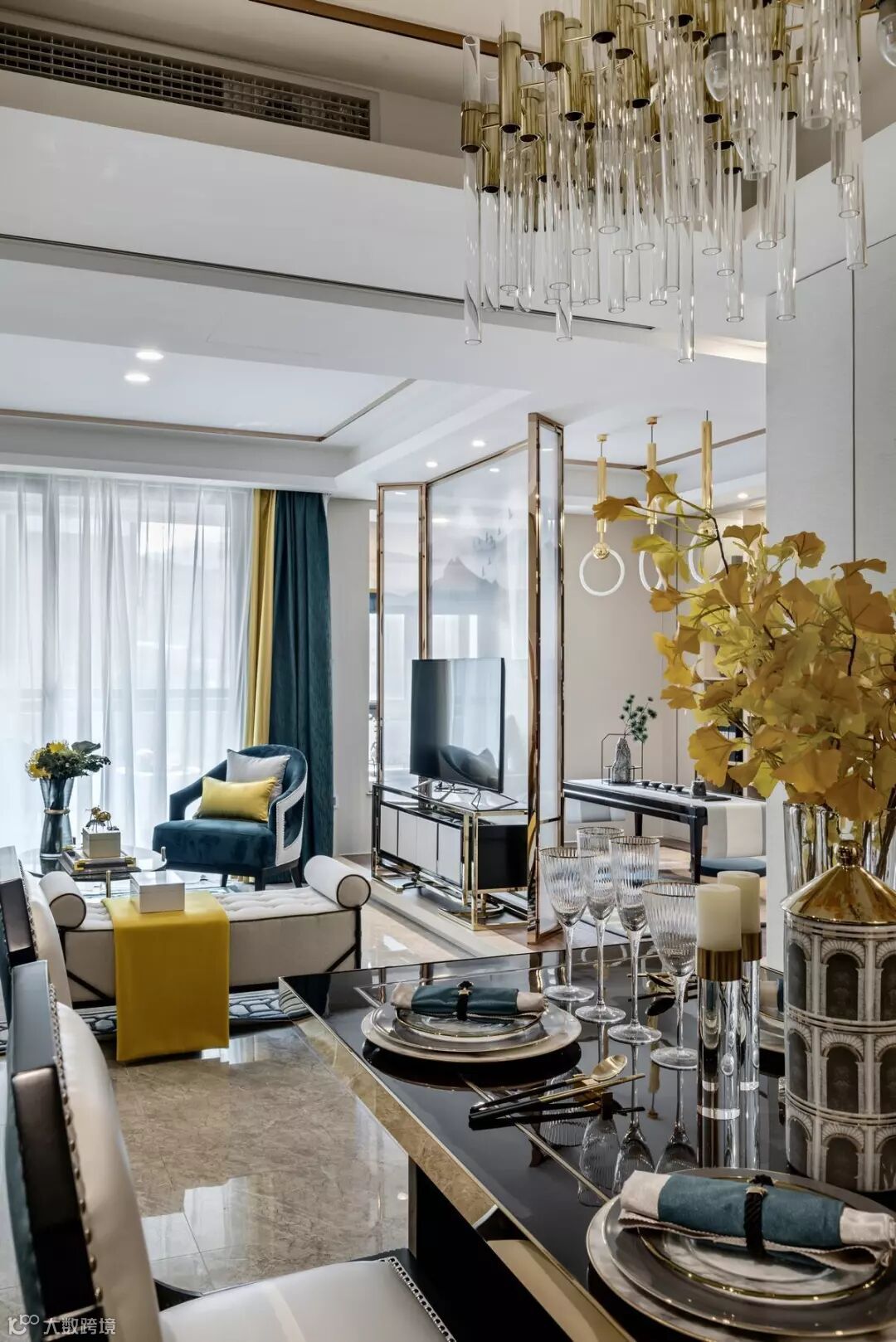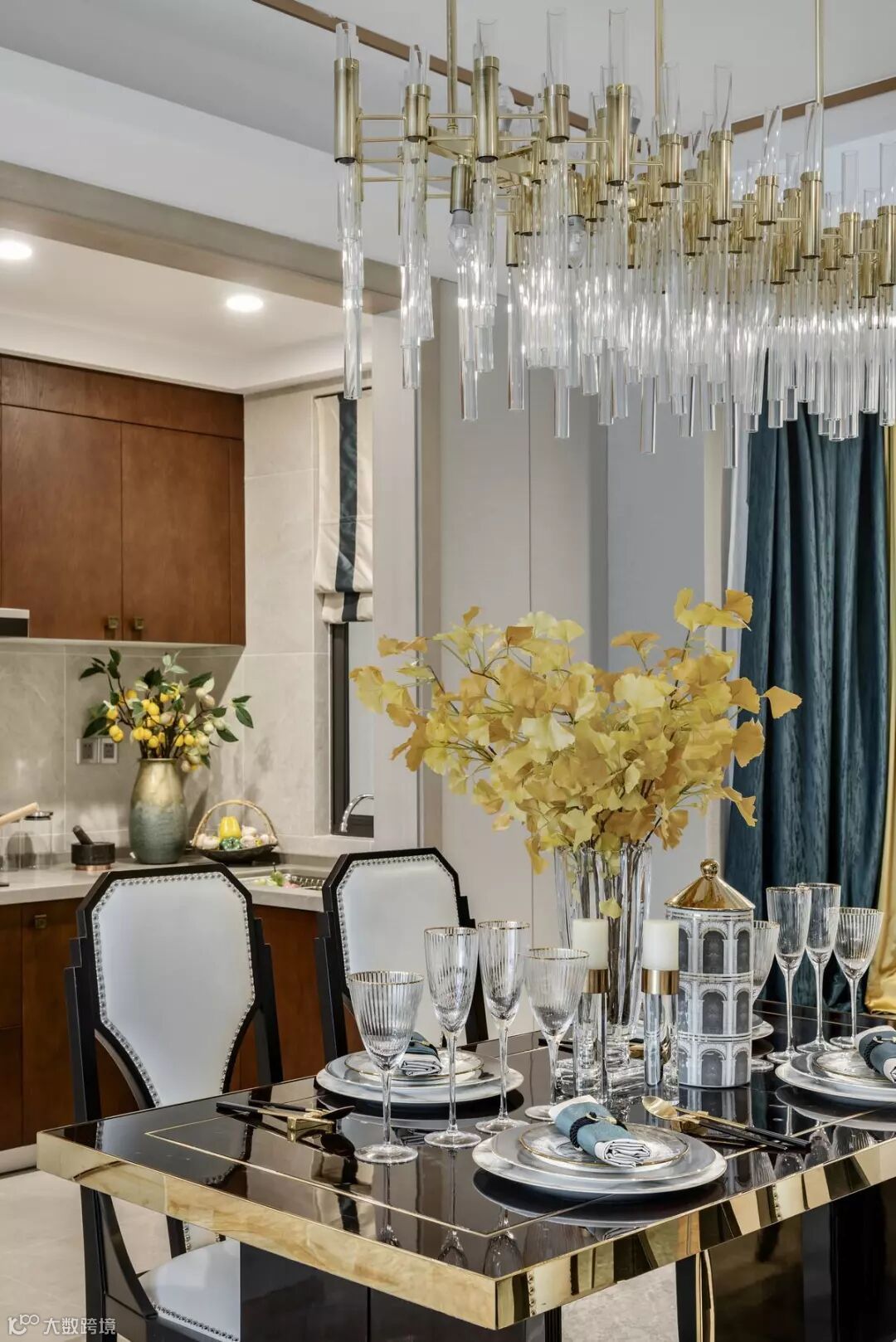 到了餐厅,空间的气质和格调又有了些许变化,水晶吊灯和金属家具的加入让奢雅范重新回归到了舞台中心。