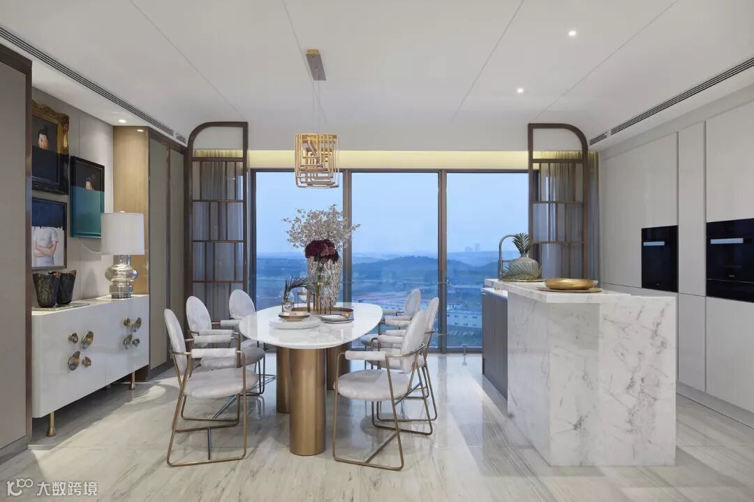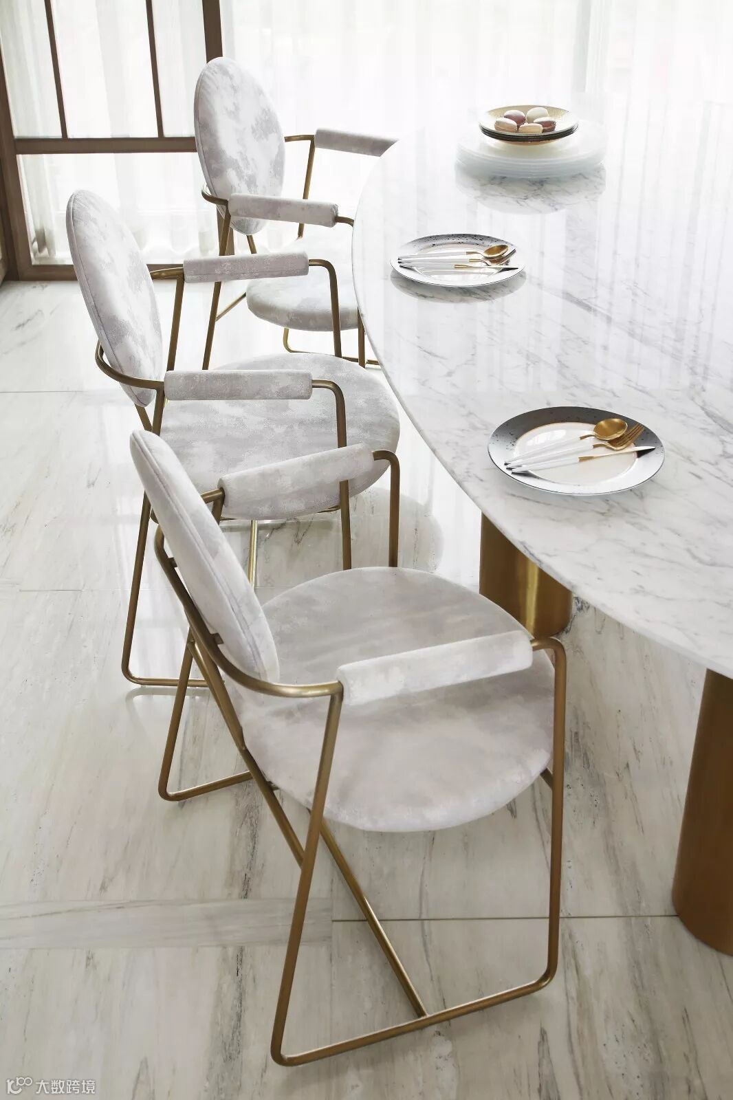 餐厅整个空间较为狭长,我们在餐厅区域选用椭圆形与曲线元素较多的餐桌椅,利用家具来降低视觉拉伸感。
