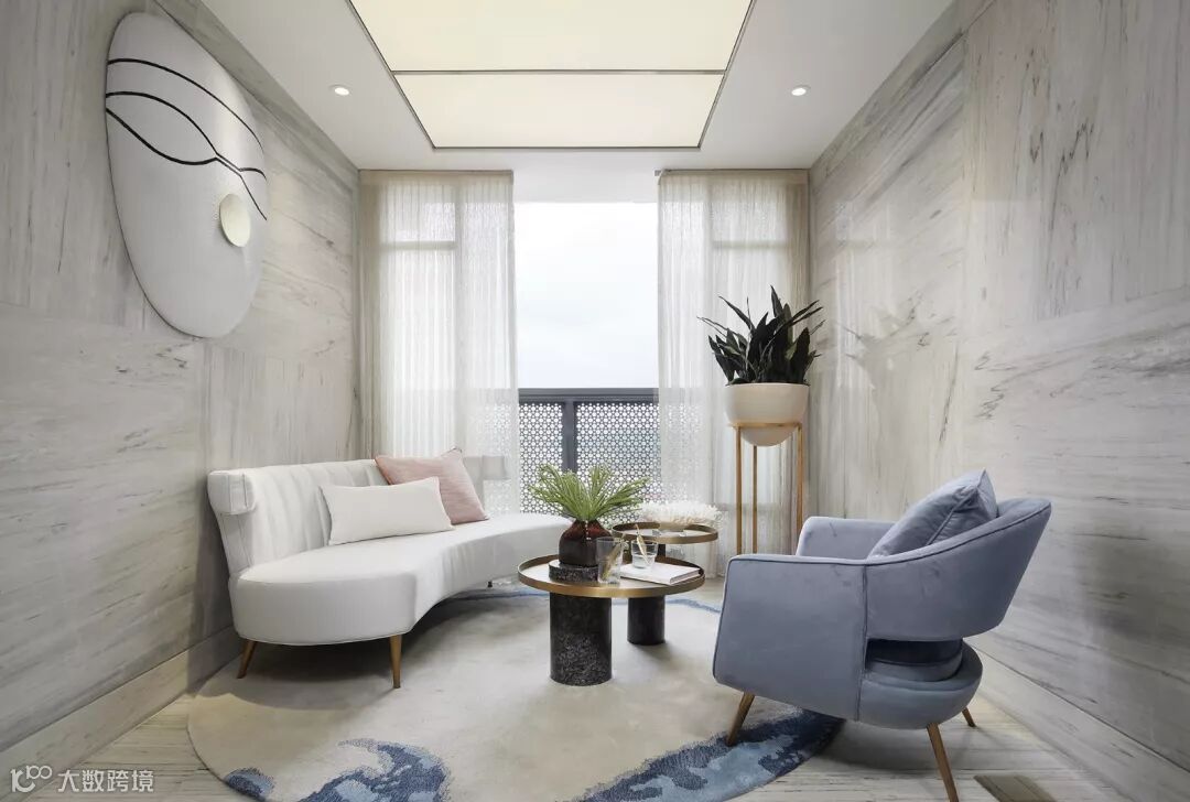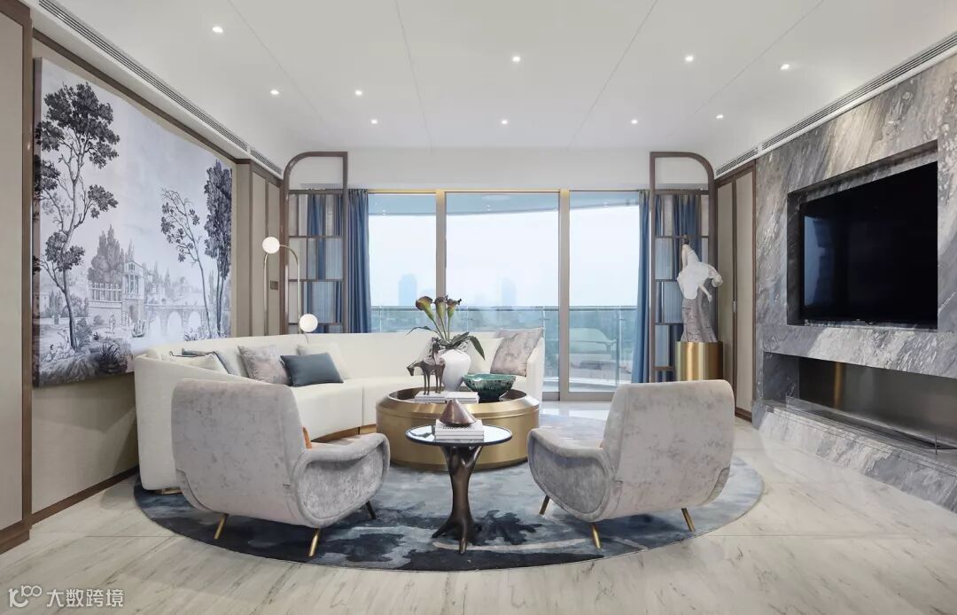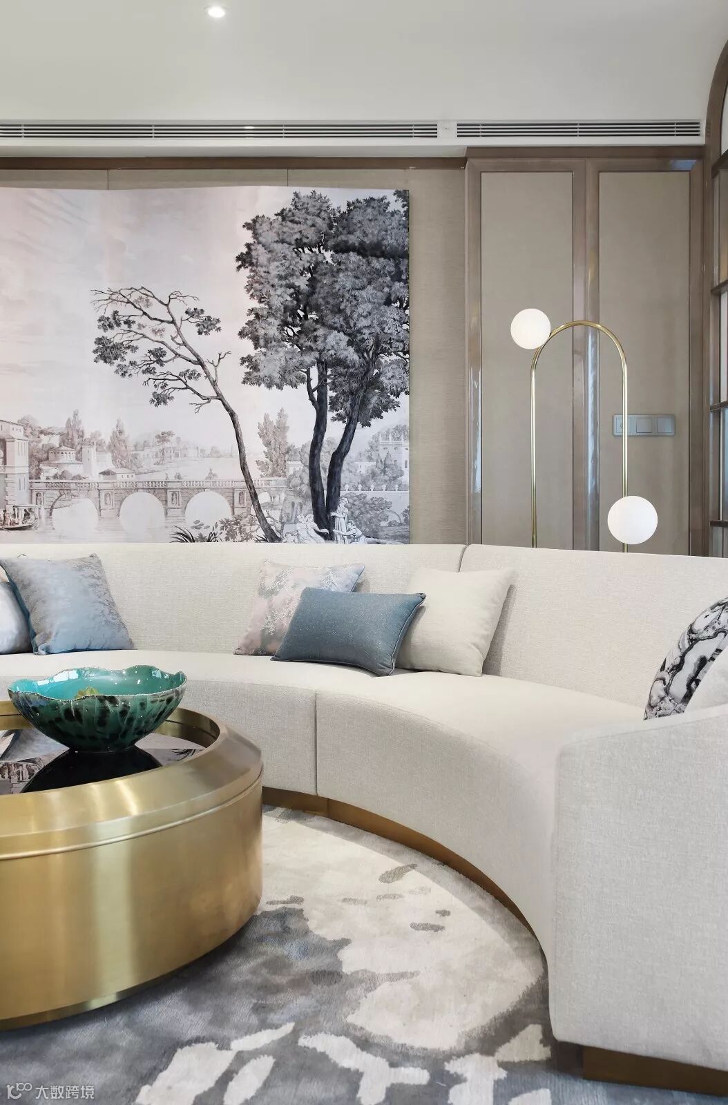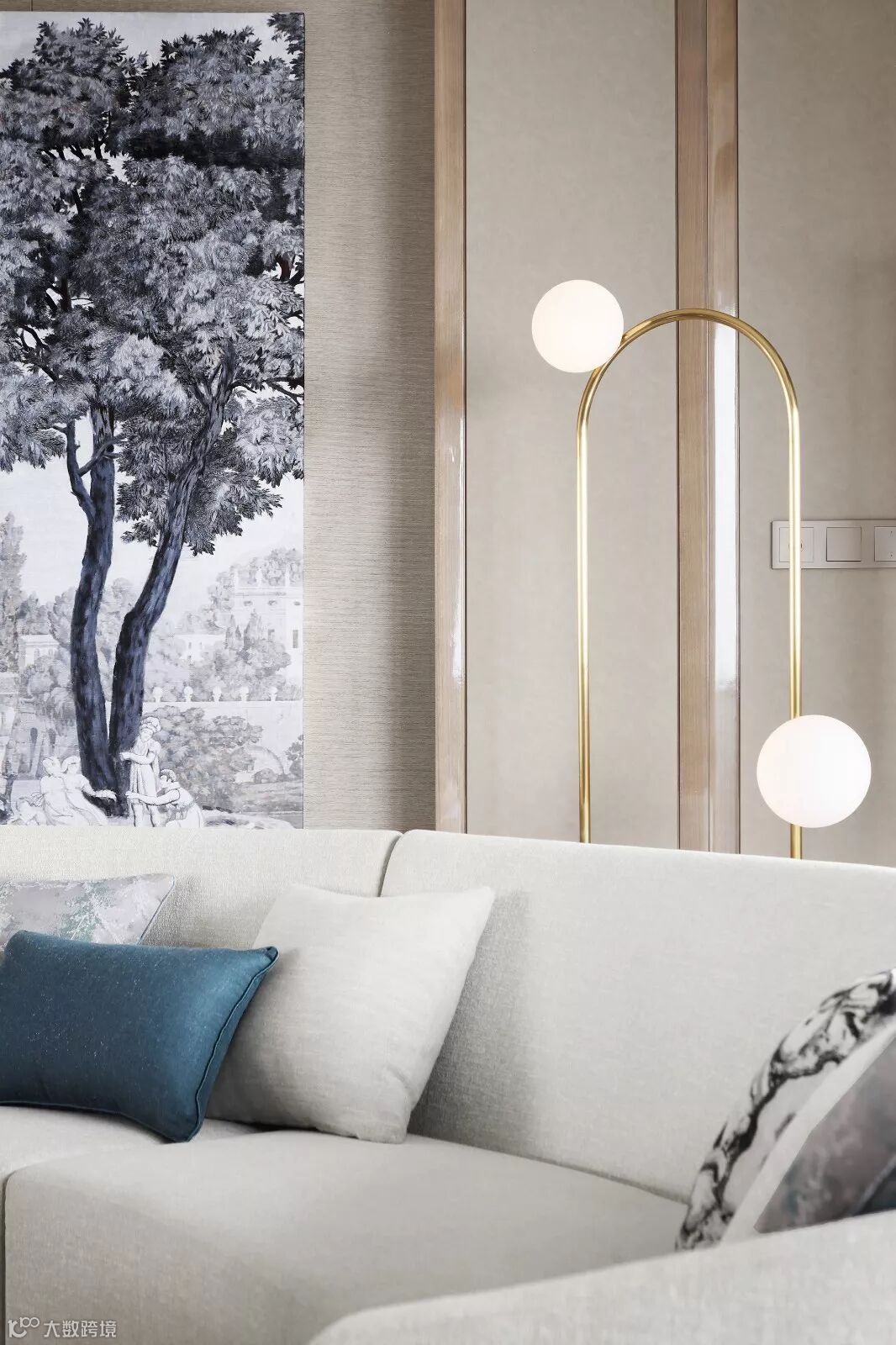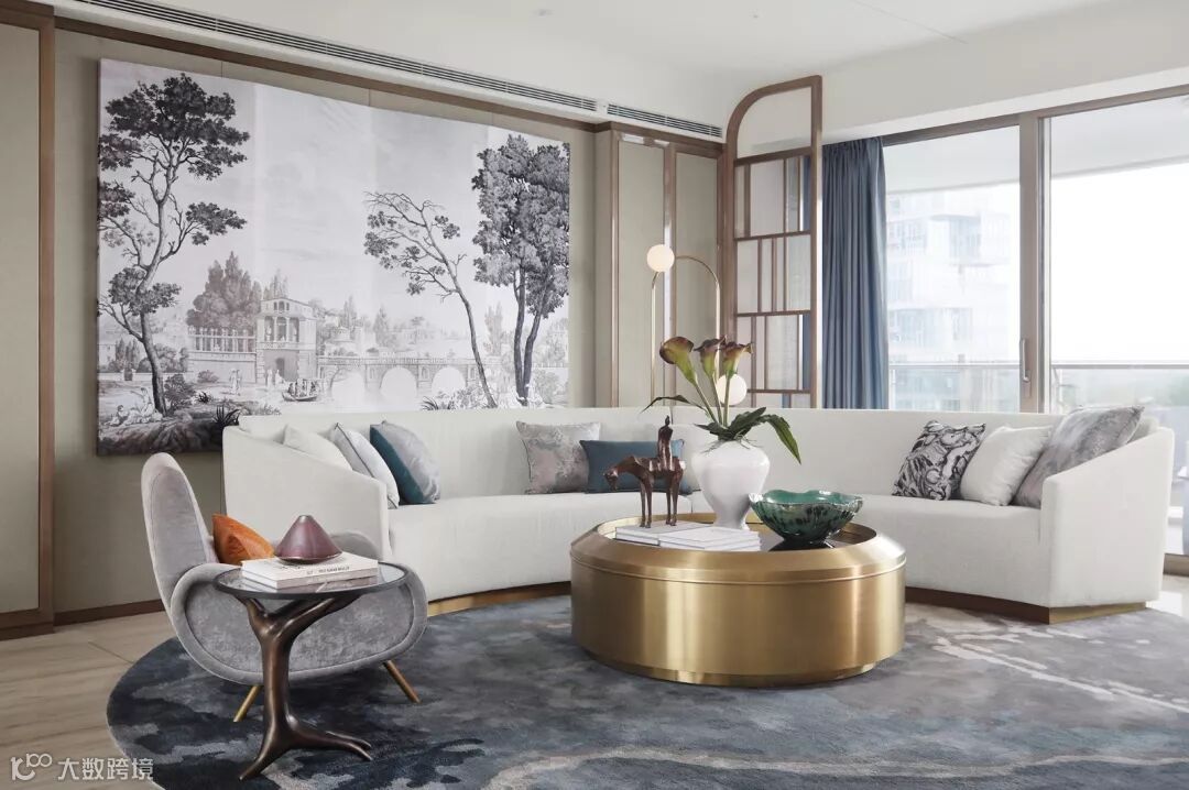 设计师汲取水能容纳百川的胸廓,将水静谧的颜色融入方案之中,水波状晕染的地毯、间隔的抱枕以及点缀的窗帘,都以高雅的青蓝色为主,营造出优雅不纤弱低调但奢华的氛围。