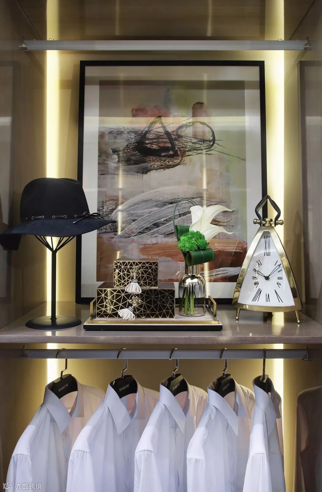 合理空间布局,让衣帽间更显宽敞明亮,三角形的钟表配百合花,让空间更加精致,处处透着馨香。