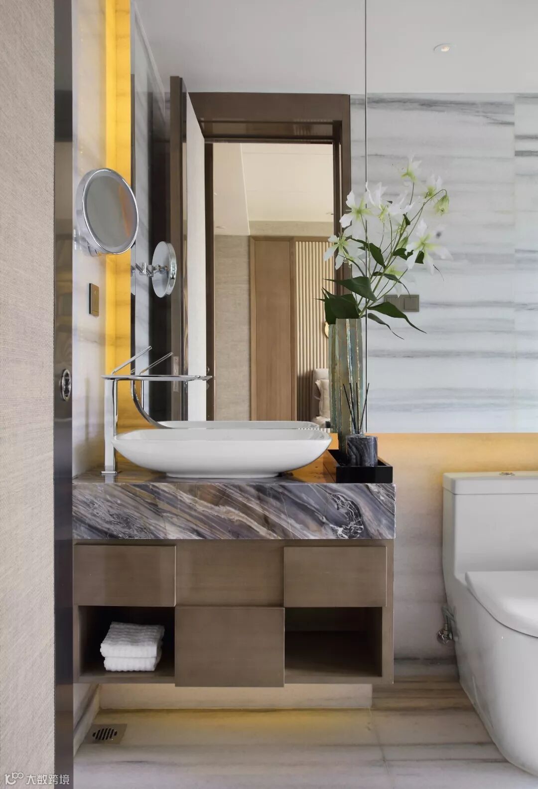 金属元素被应用的淋漓尽致,浴缸对着精心挑选过的挂画,让沐浴成为一种艺术享受。带着纹理的大理石地板,沉稳大气有质感!
