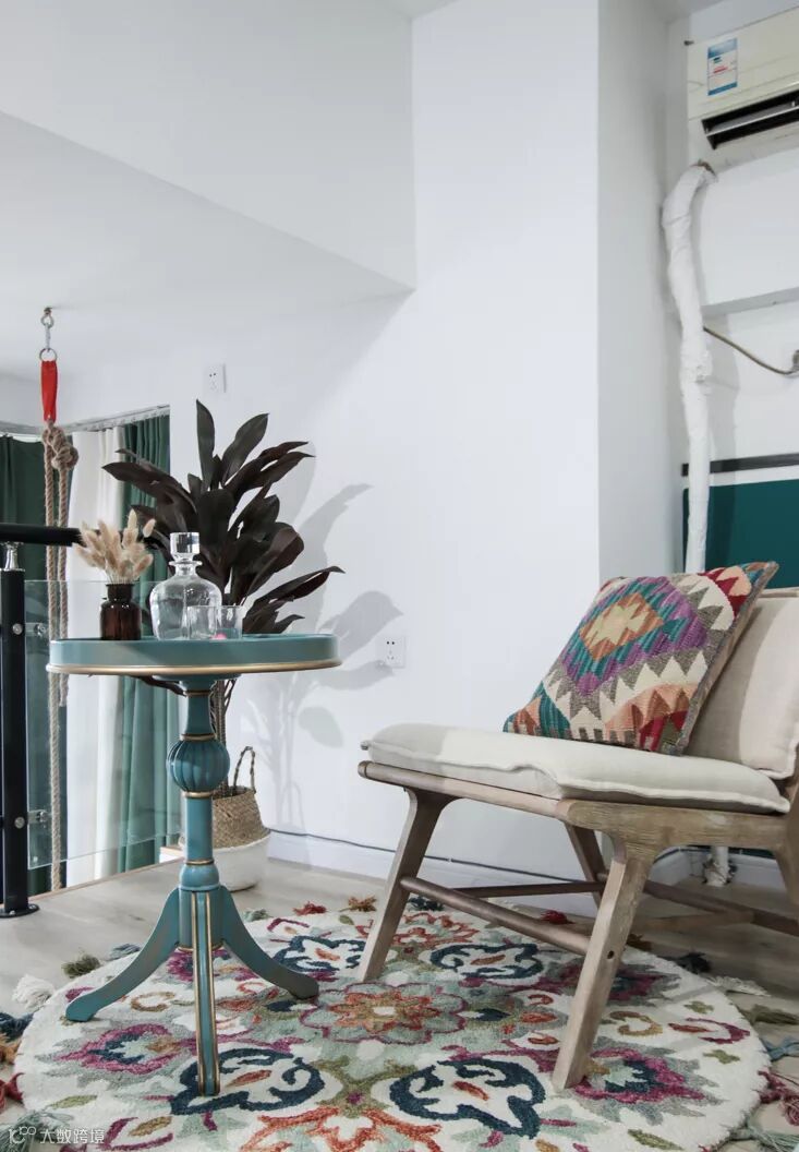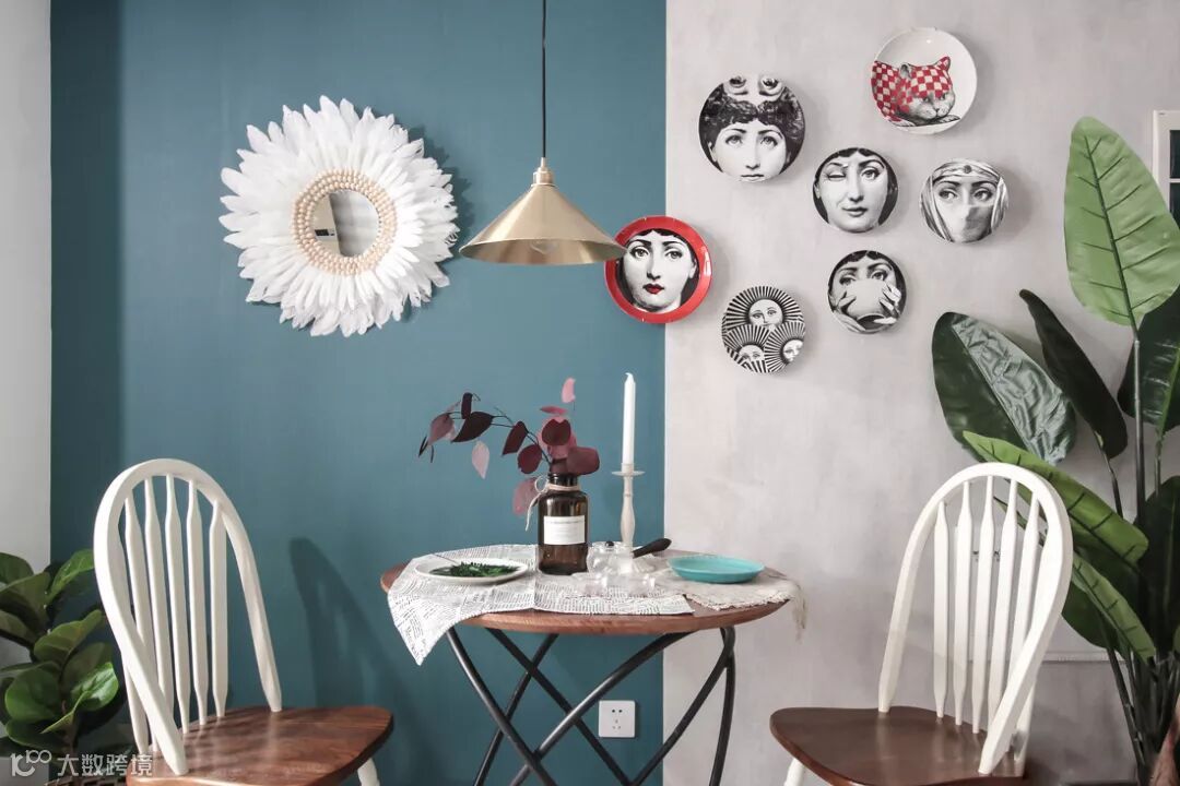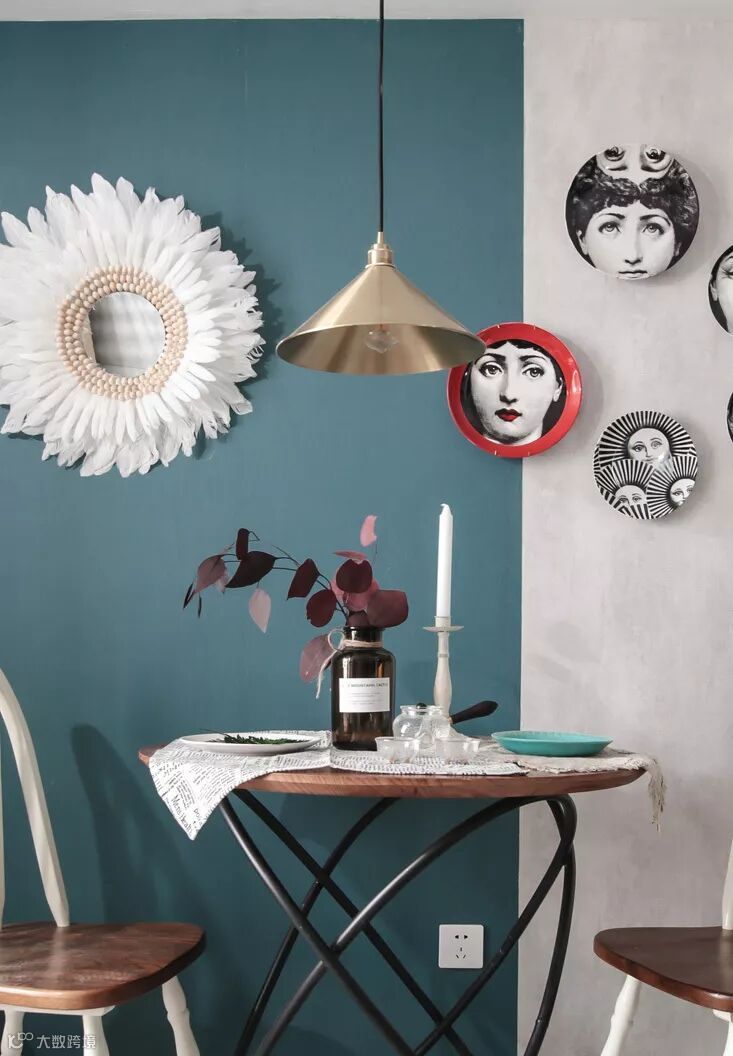 动与静的结合,装饰诙谐的挂盘,反映出业主对于生活的随意和幽默,手工编织的羽毛镜是业主去土耳其旅游的时候带过来的。