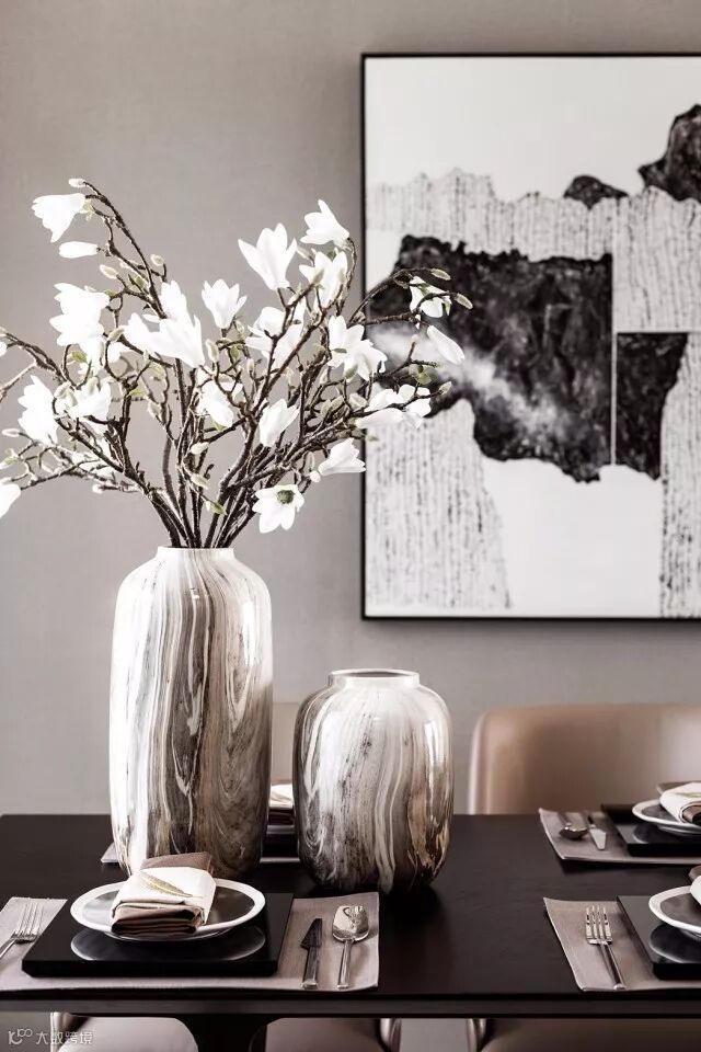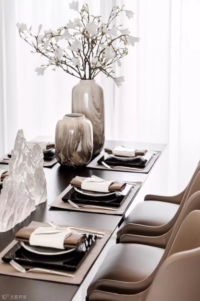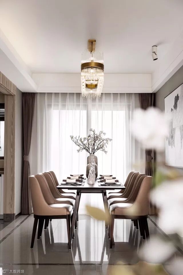 将灰褐色运用于空间设计中,搭配皮革餐椅、精致的艺术吊灯与新中式元素的饰品相结合,自然质朴、轻奢与温暖。