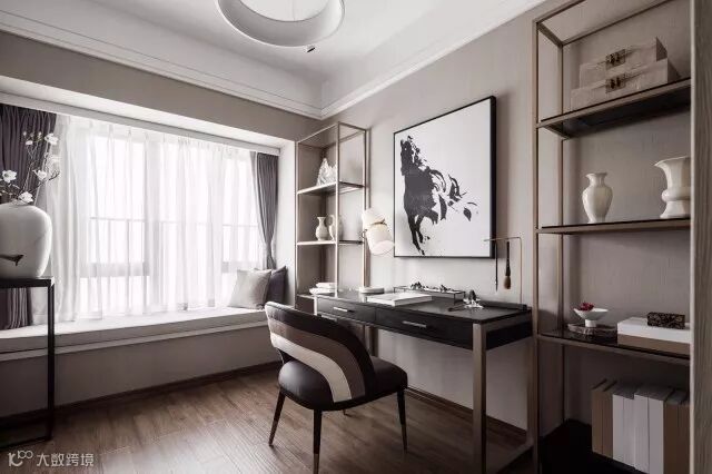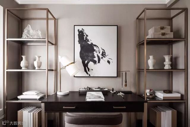 书房整体色调较沉稳、优雅、别有韵味,能让阅读成为一件愉悦心性、陶冶情操的事情。两侧书架硬朗的金属材质,可以彰显时尚的质感。