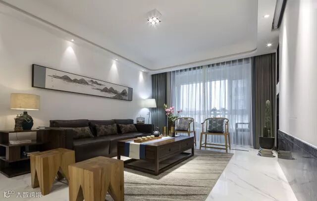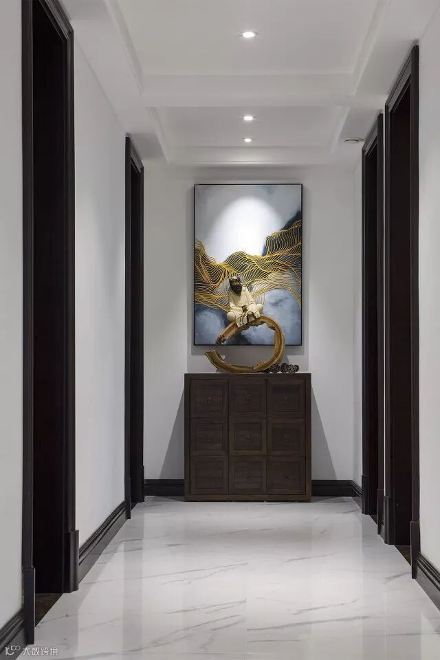 本案以山水画为轴线铺陈开来,传统中式家具、结构,以及淡雅色彩的运用,大气而有意境。设计师在中式风格基础中融入当代的创新设计,完美诠释新中式风格的韵味。