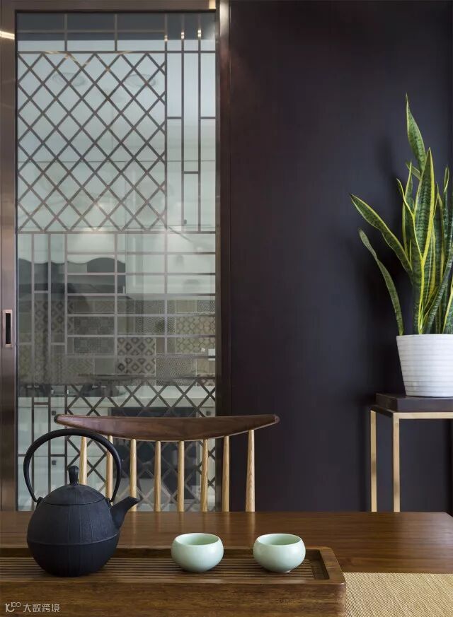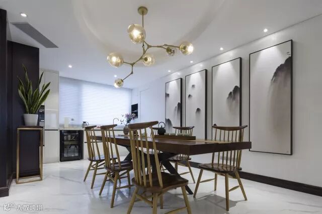 餐厅墙面的中国山水画于细节处体现文化传承。桌面上的小绿植汲取着这古典而又智慧的力量,蓬勃向上,绿意盎然,为一室增添生机与灵动之感。