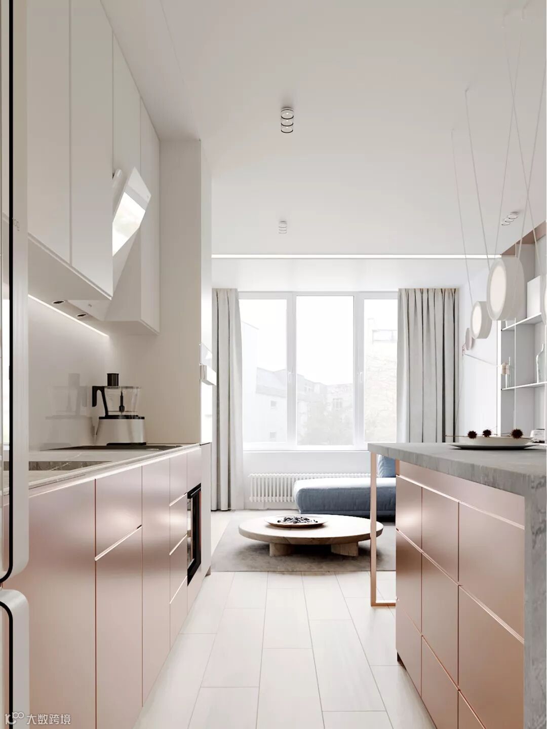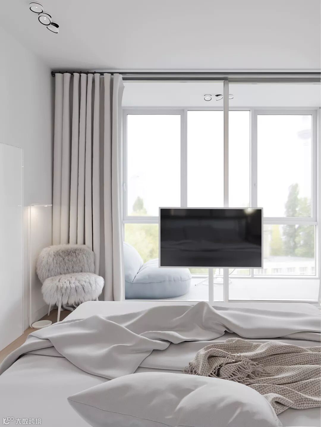 设计师运用大面积的落地窗,将自然界的光、新鲜空气、透过轻纱的隐约美景引入室内,营造清新自然的氛围。