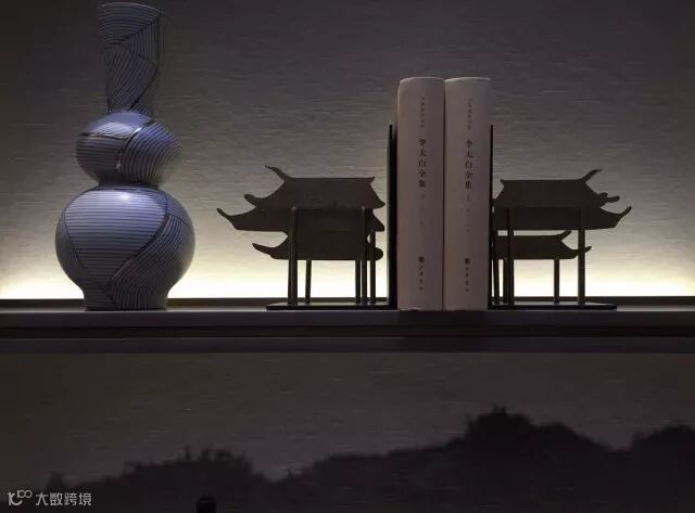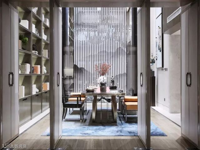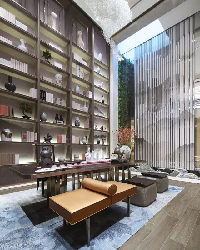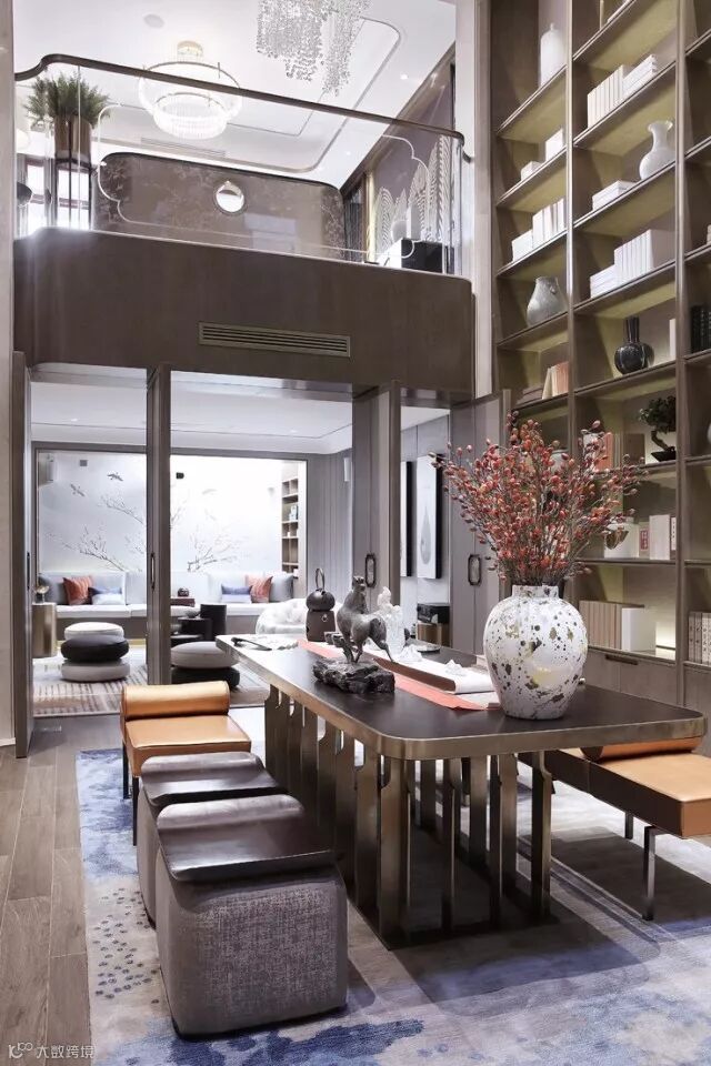 书房于中庭共享空间之中,气势高耸的书架,以简雅之器与古博之书突显了中式人文气息。