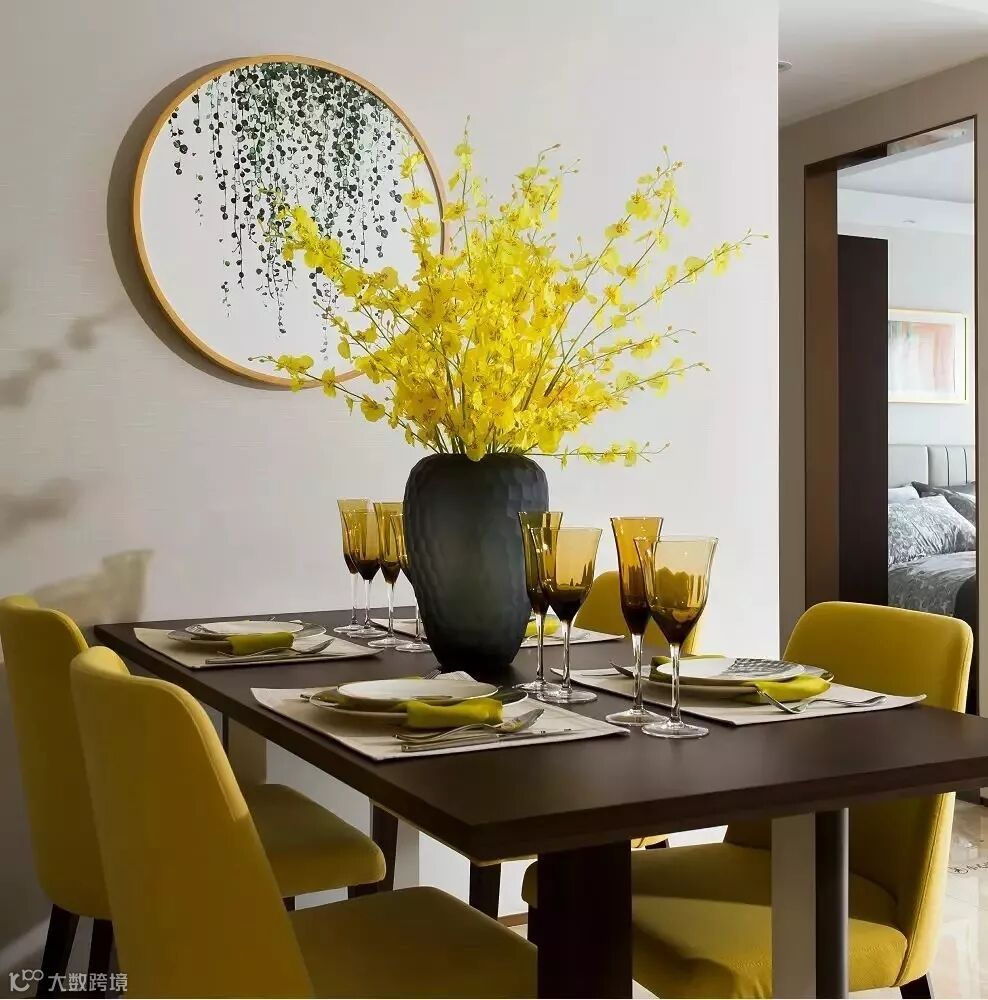 半开放式空间总是让人心动,餐厅延伸了客厅的色彩基调,同时又增添了一丝俏皮诙谐有趣的元素在内,鲜嫩饱满的玉米黄,卓有趣味感的餐具,强化了就餐的体验感及食欲。