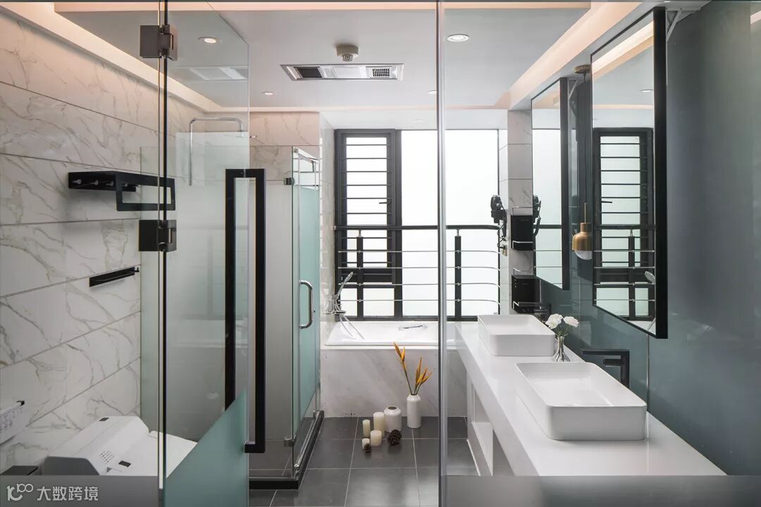 主卫,考虑双台盆设计,满足夫妇上班的快节奏的需求,不浪费彼此的时间,并且考虑浴缸,浴缸可以很方便的给小朋友洗澡,也可以在自己一天忙碌的工作之后可以泡一个舒适的澡解去一天的疲惫。