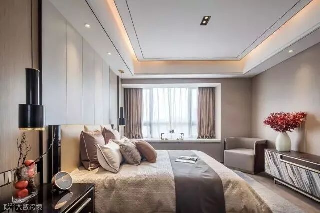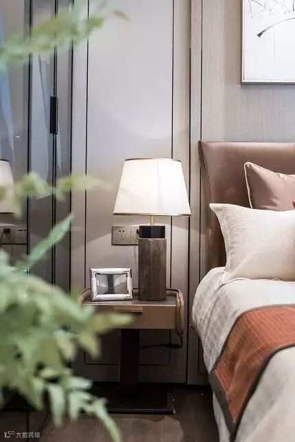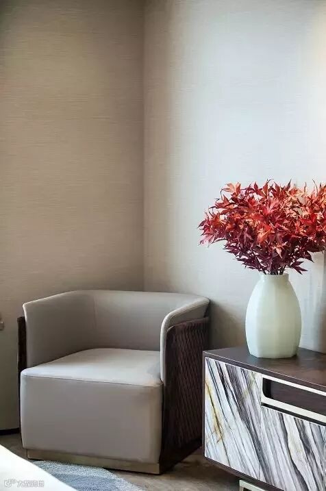 主卧的电视柜,看似寻常,正面却是用手绘画出真实的大理石效果。花艺成为点亮居室的神来一笔,枯枝、山石、水果,巧妙搭配,自成风景。