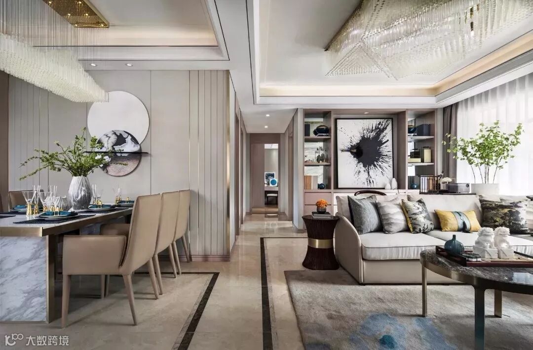 客厅与餐厅贯穿,配以整面的落地窗引入自然的光照与灵气,身处一隅,也觉空阔透天。