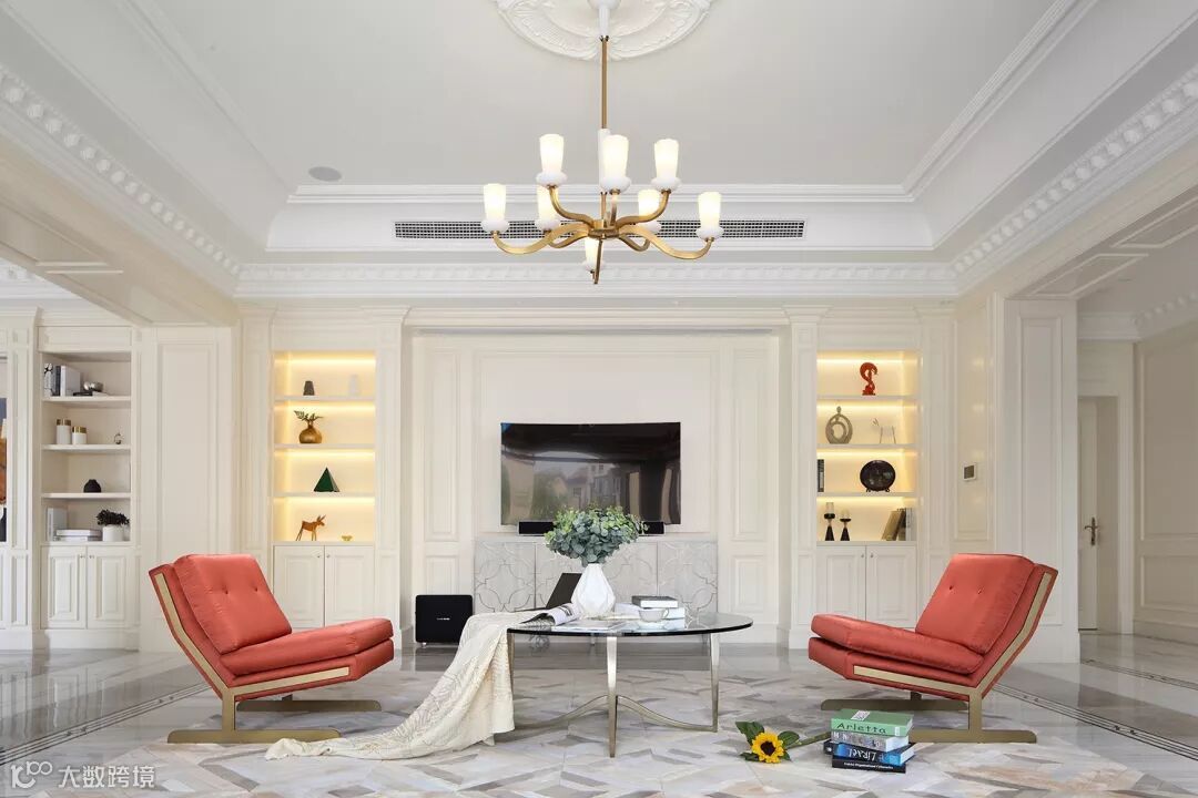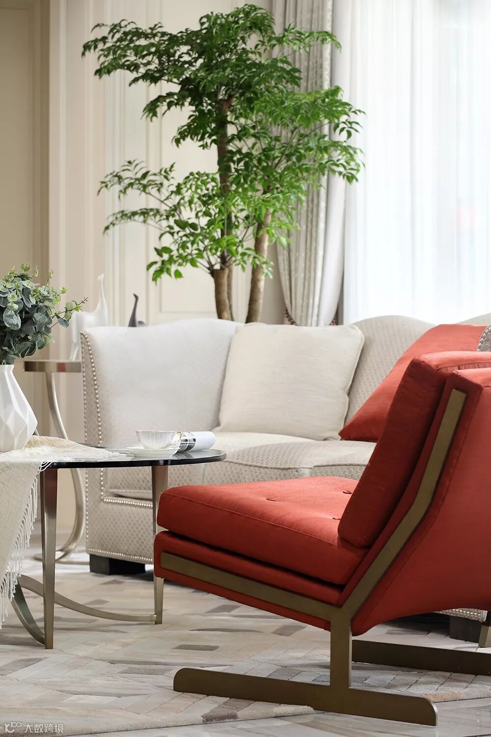 宽敞的起居室由米白色的墙板包层,同时还有一些定制的展示柜,将跳跃的橙色单椅、浅灰地毯以及干净的白色布艺融合在一起。