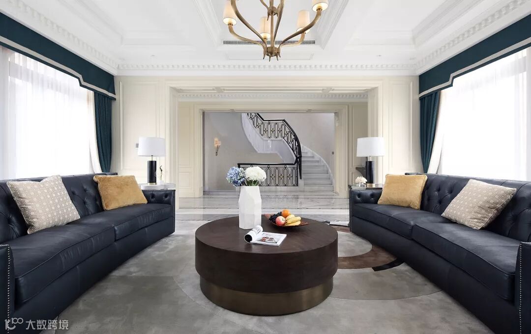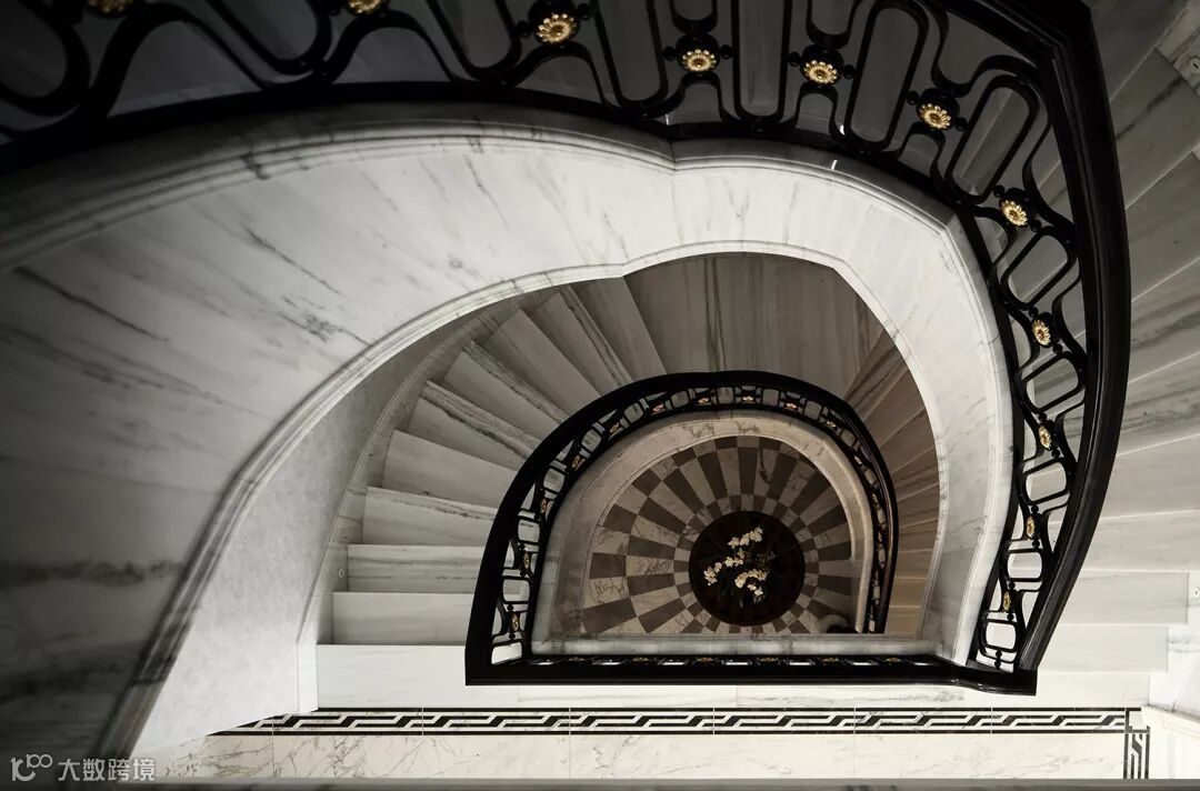 客厅走廊与主卧室呈现直线,它将整个一层住宅融合在一起,而在客厅的一侧,蜿蜒的楼梯盘旋而上,延伸至二层,黑与金带有古典造型的楼宇也使得空间更精神。