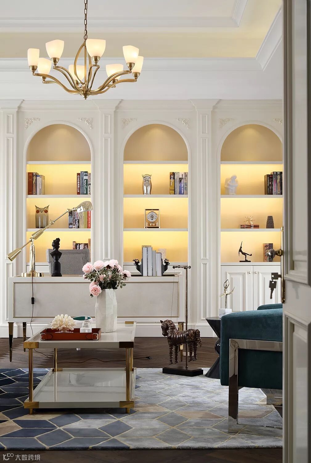 两面分割的圆弧形的窗户预留出的窗帘盒子,形成了一处两面看景呼吸,别致的古典手法打造的景观分割。