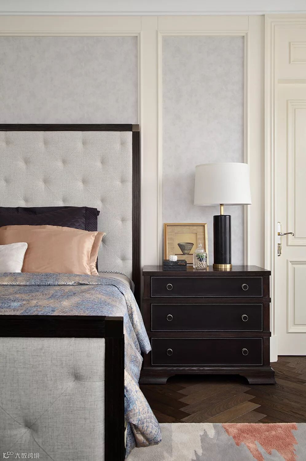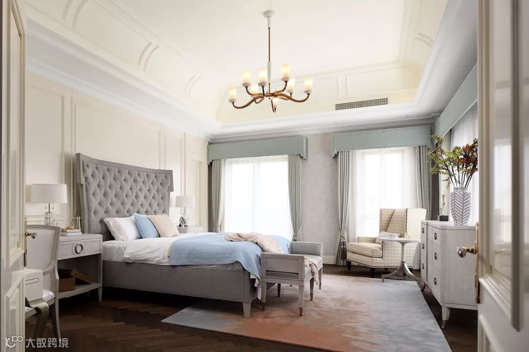 整体卧室的打造失去色彩的倾向性,混合着和谐雅致的中间色调,蓝中有灰,绿中有蓝,灰中带粉,各种颜色的柔和营造出空间中的平衡与和谐。