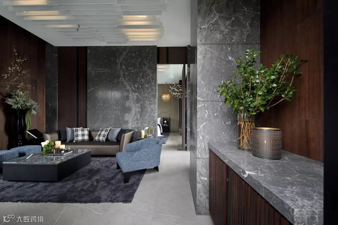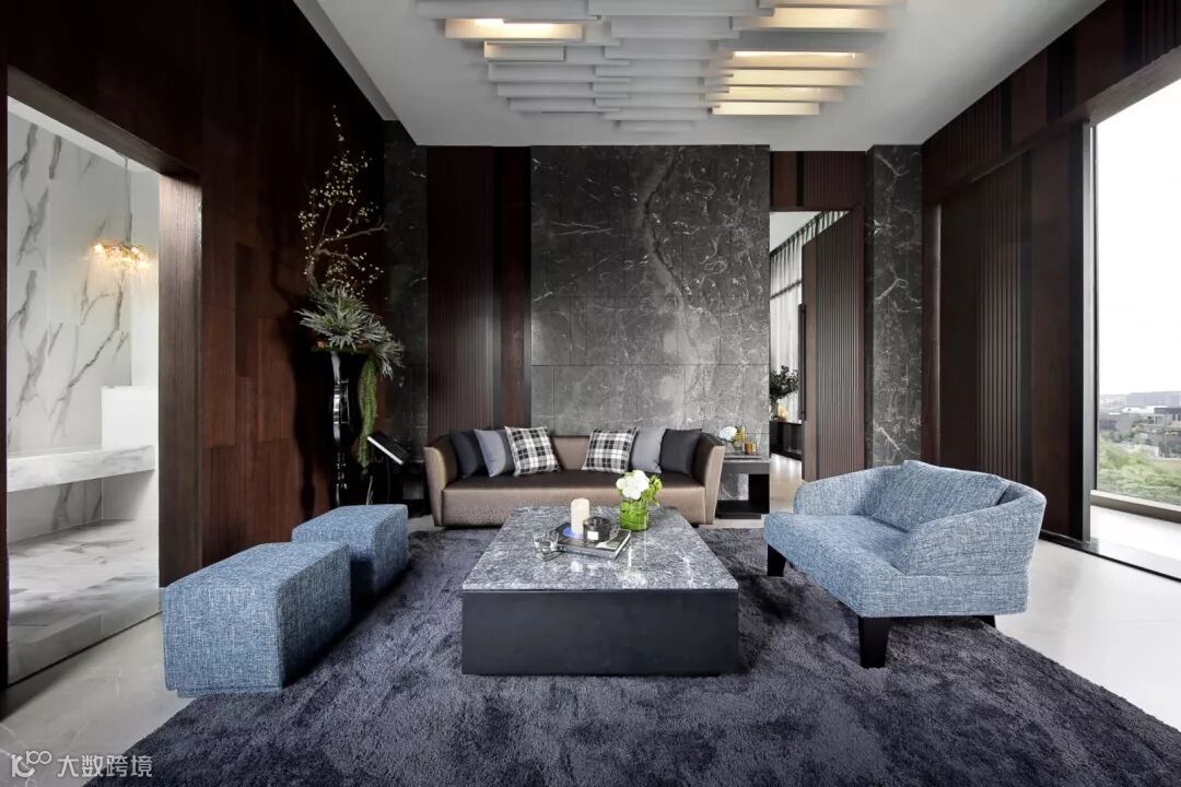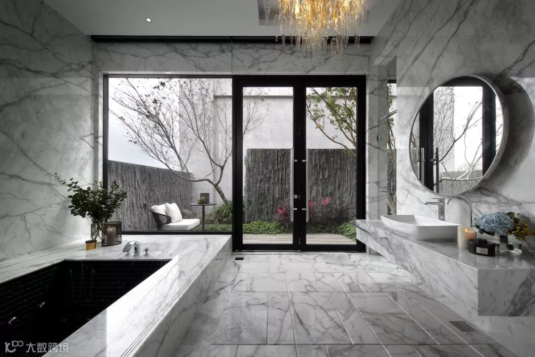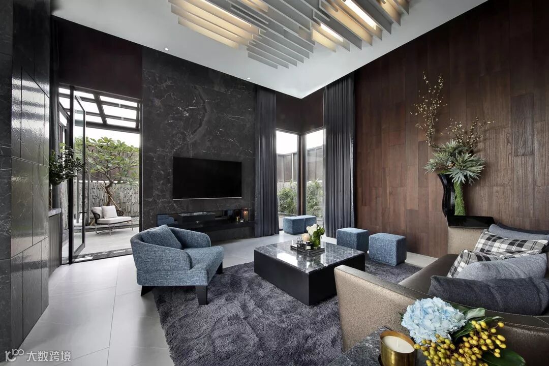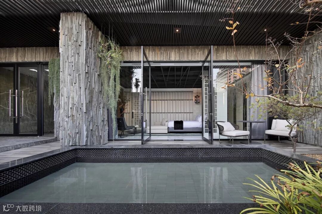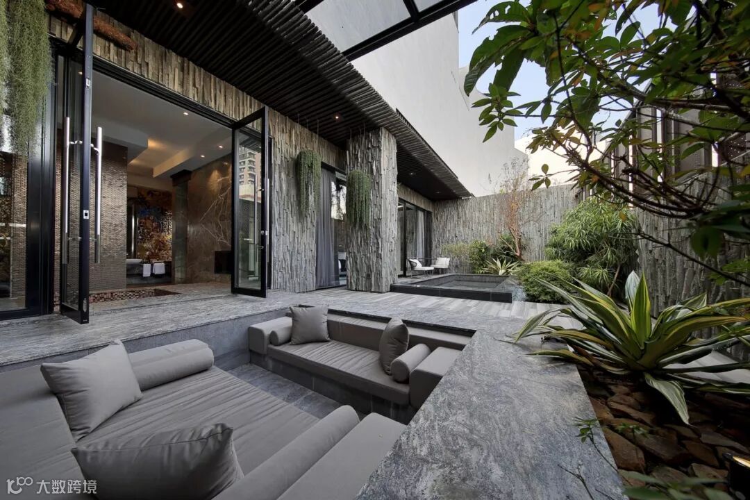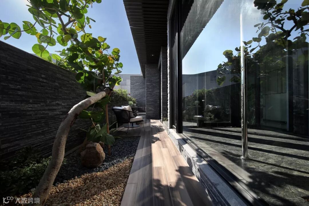 室外劈面石材短墙衬底搭配植栽与老树连接无边际天际线,两者室内外空间达到自然、美学与机能效果,召唤出一种感性优雅韵味。