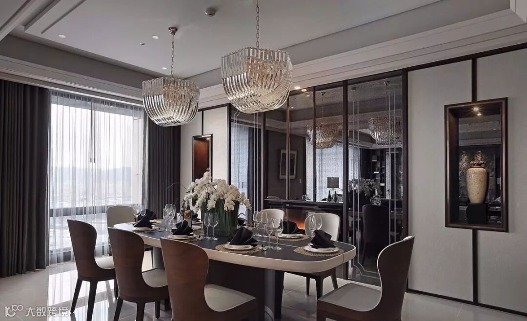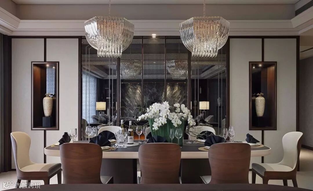 客餐厅即是以东方文化脉络出发,结合西方古典元素来呈现。客厅位居空间主轴,隐含中庸之道,饰以镀钛边框,气势不凡。
