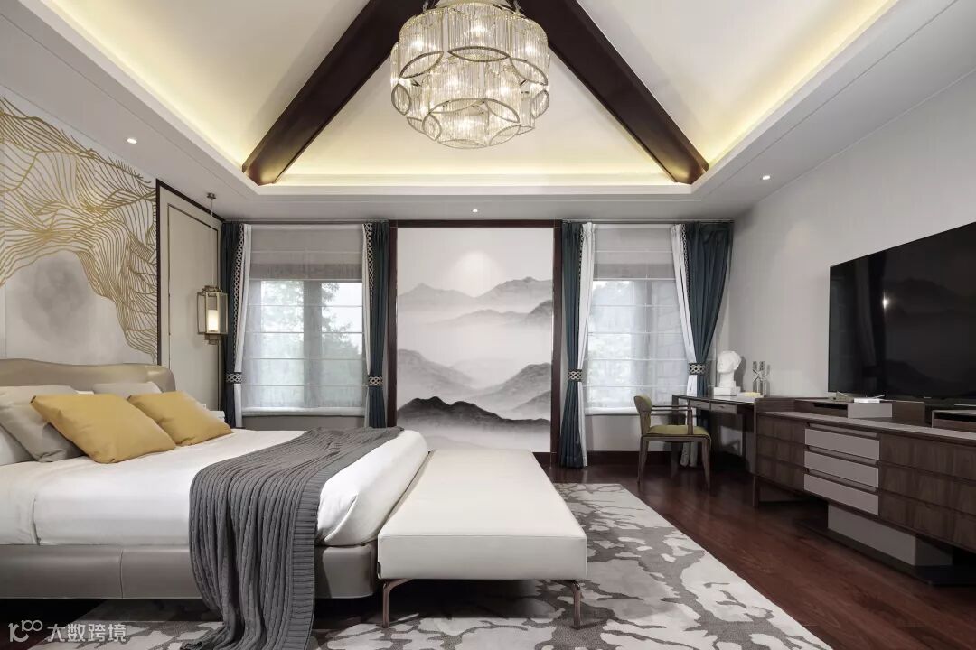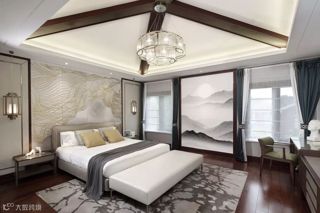 内敛柔和的水墨山水在这样精致下也不逊色,渲染在墙面上复古韵味的禅意展现的淋漓尽致。温润宜人的现代东方设计晕染贵气风雅,富中见贵,贵中见雅,雅中见灵。