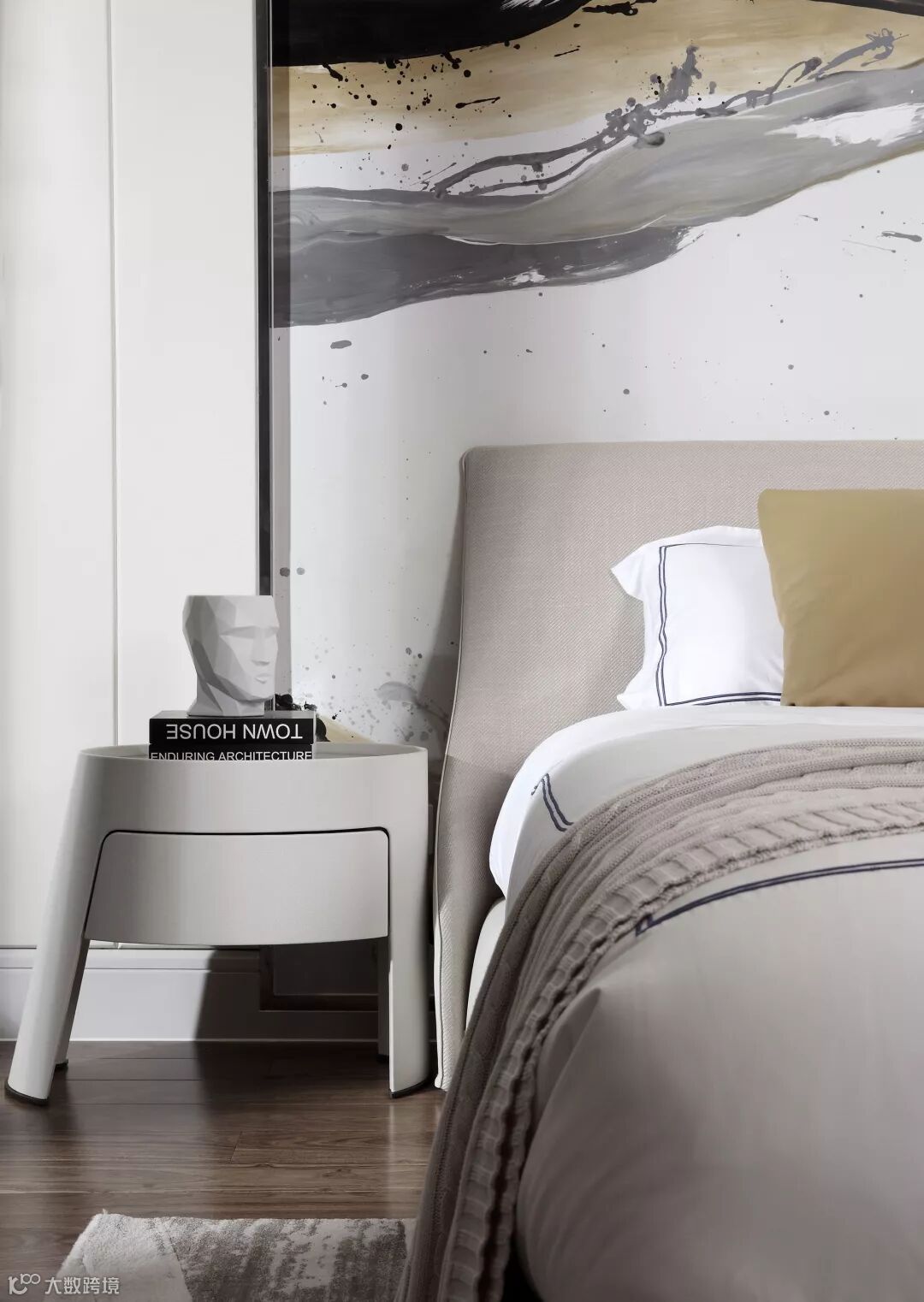 主卧室床头背景处牡丹花的花瓣在幻化与色彩重构之后,展现出凝于线条的情调,蔓延在舒展开来的每一条细纹之上。