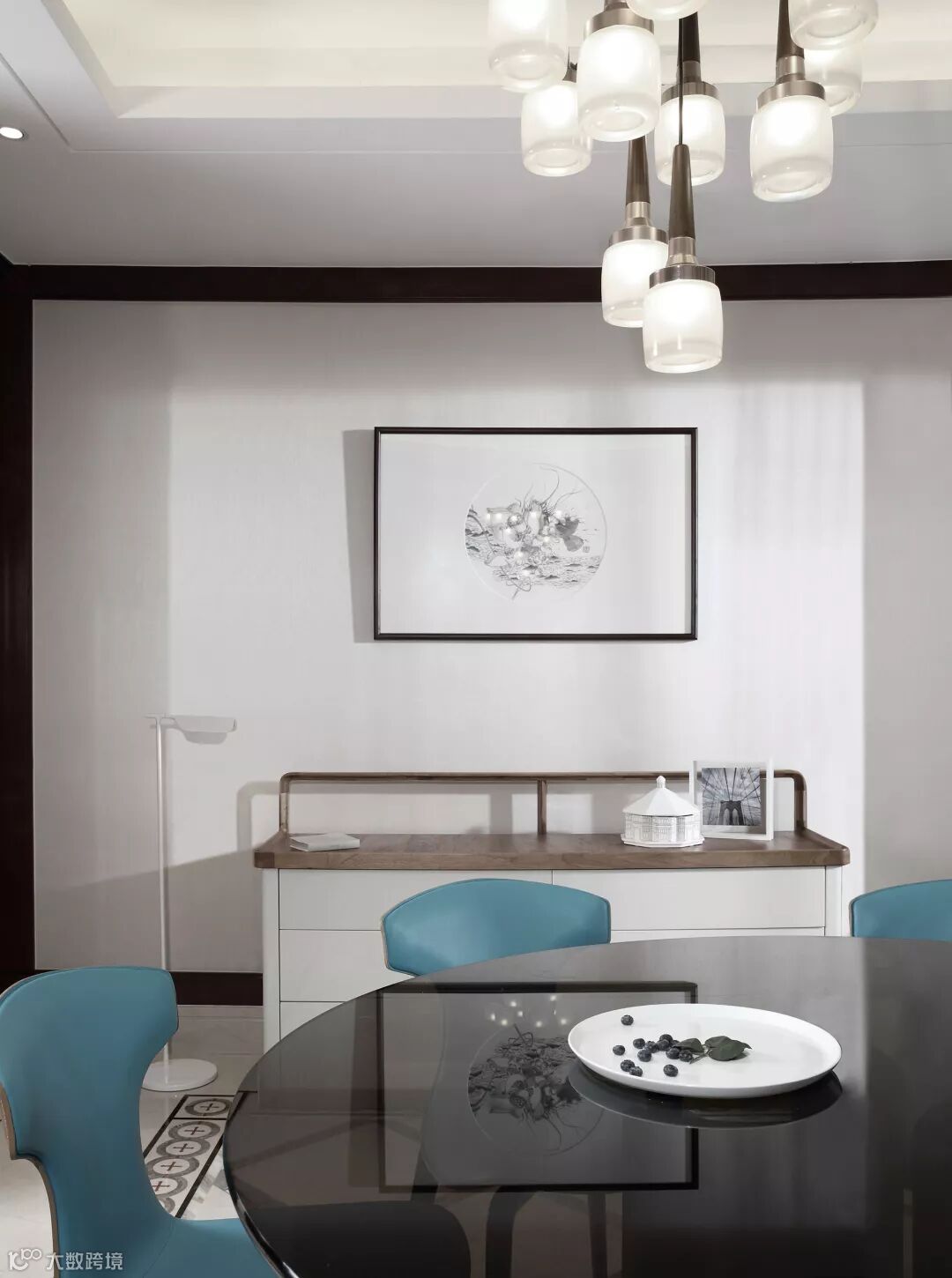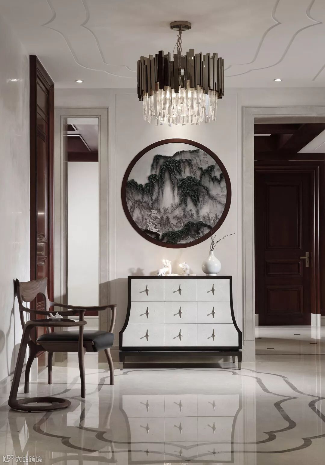 皮质端景柜现代感十足,经典的改良圈椅则诠释传统韵味,朦胧的山水画在水晶吊灯的闪烁下流淌禅意,相互交错之间,现代与复古交融,勾勒出本案门厅新中式的神韵。