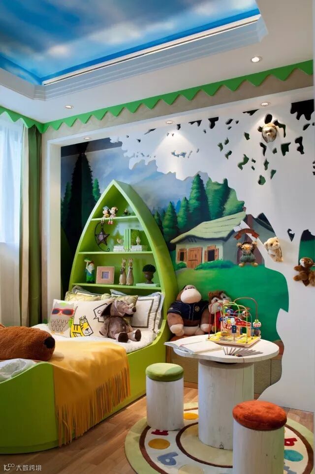儿童房里用缤纷的色彩洋洋洒洒绘画出一处凡间天使的童话森林。公仔、帆船床连书架,树干桌椅赋予了更多想象的画面。
